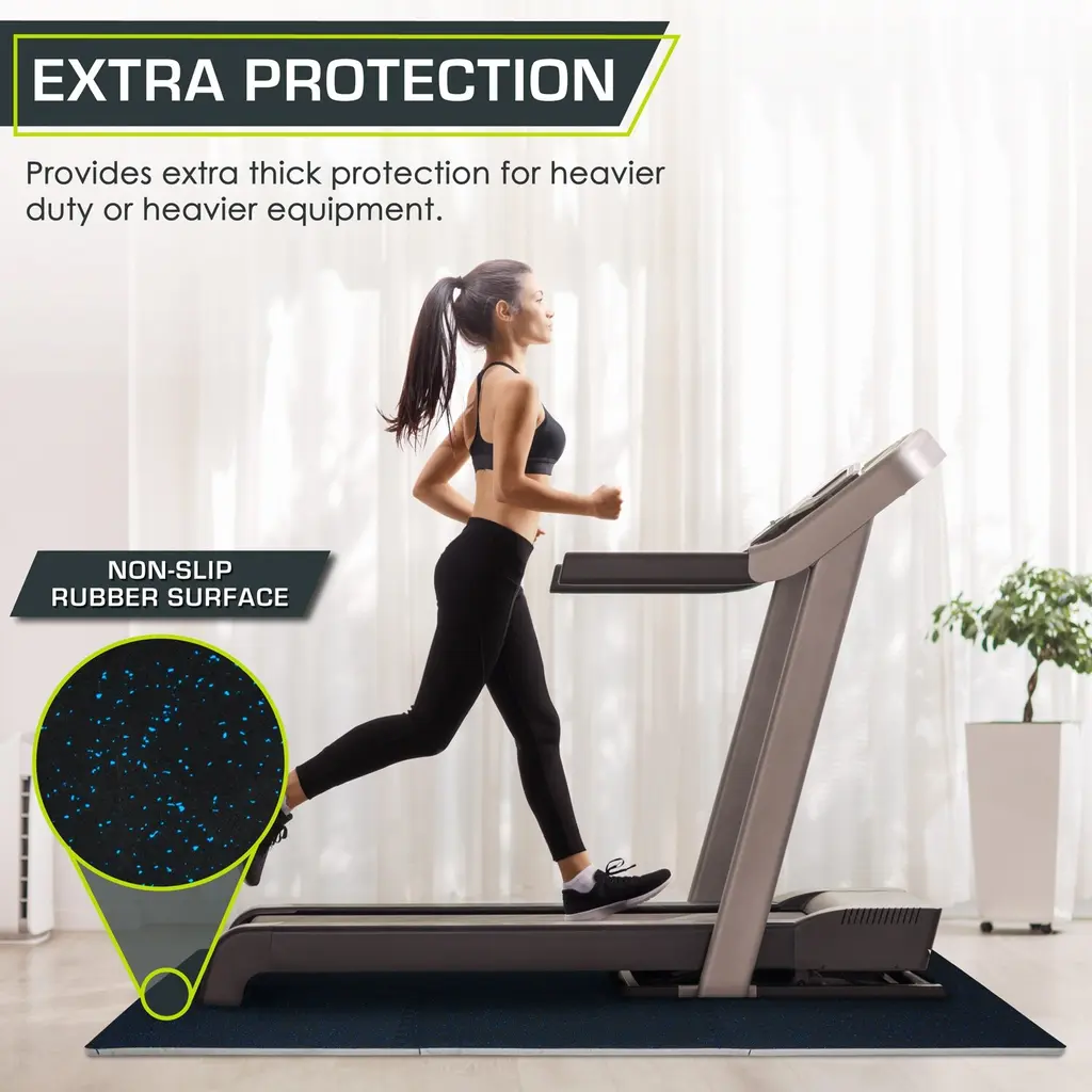 The ProsourceFit Rubber Top Exercise Puzzle Mat ¾ inch is the perfect flooring to turn any space into a fitness area. Protect your floors and yourself during workouts with these ¾-inch dual-layer tiles. The rubber top is a durable, textured surface to prevent slips and resists water. The bottom layer of high-density EVA foam creates a sturdy cushion that absorbs impact from equipment and high-impact exercises. Easily assemble exercise tiles with jigsaw edges and connect the border pieces for a clean, polished look. The puzzle edges securely interlock each tile so they stay in place while you exercise. Perfect for gyms, garages, basements, playrooms and more!