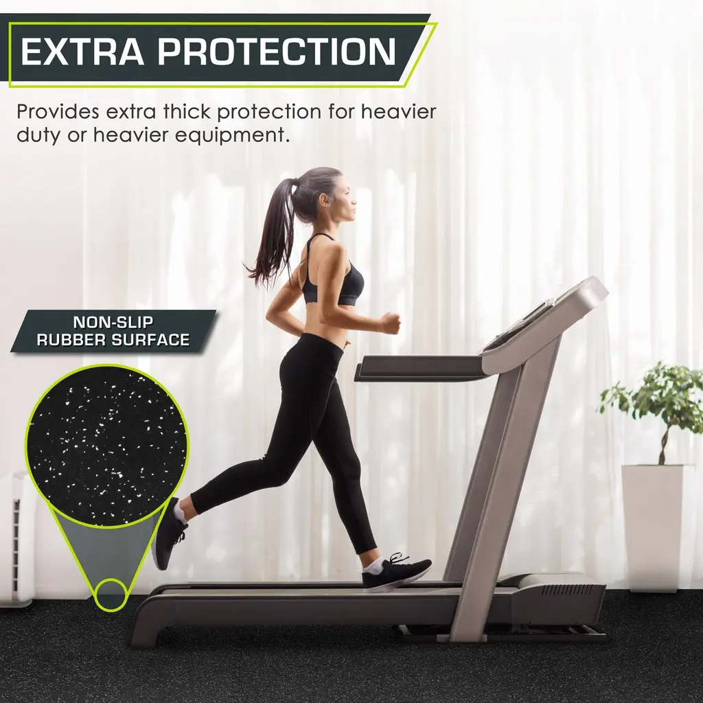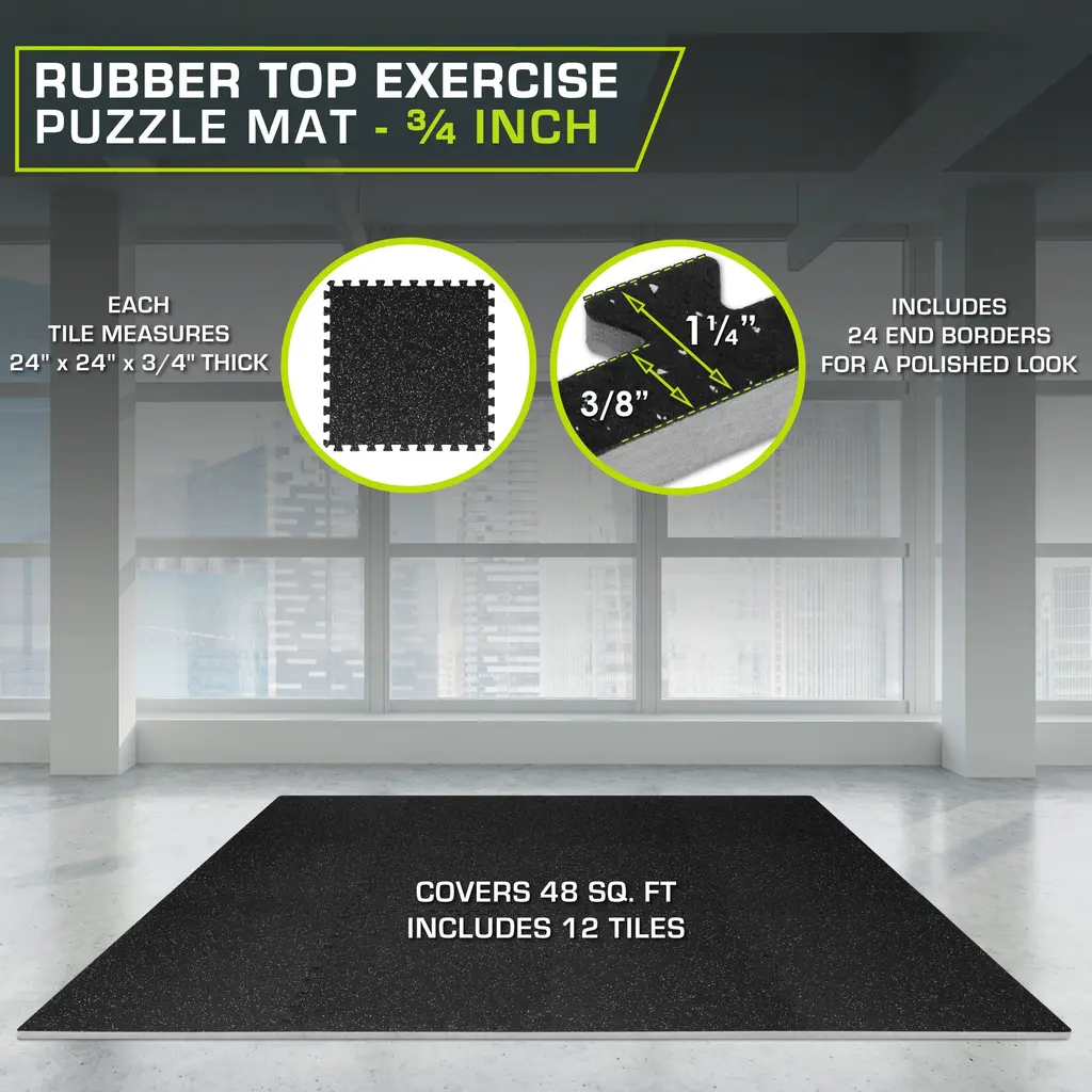 The ProsourceFit Rubber Top Exercise Puzzle Mat ¾ inch is the perfect flooring to turn any space into a fitness area. Protect your floors and yourself during workouts with these ¾-inch dual-layer tiles. The rubber top is a durable, textured surface to prevent slips and resists water. The bottom layer of high-density EVA foam creates a sturdy cushion that absorbs impact from equipment and high-impact exercises. Easily assemble exercise tiles with jigsaw edges and connect the border pieces for a clean, polished look. The puzzle edges securely interlock each tile so they stay in place while you exercise. Perfect for gyms, garages, basements, playrooms and more!