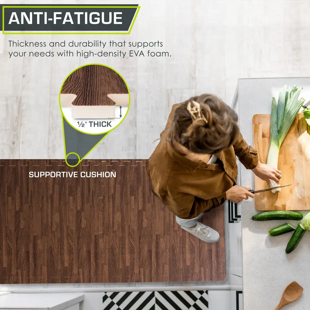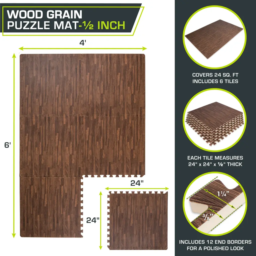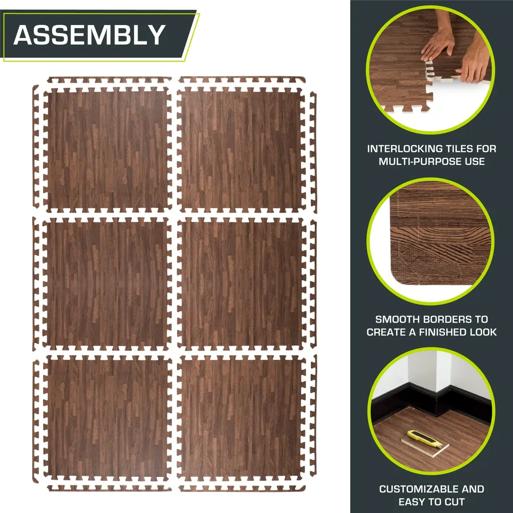 The ProsourceFit Wood Grain Foam Floor Puzzle Mat is great for a home space such as an indoor gym setup, office room, or play area as it protects any floor type. The foam floor tiles provide a safe and secure surface to work out on. Made from thick EVA foam, the interlocking tiles absorb impact and noise during exercise and provide a soft, supportive surface for exercises like push-ups, crunches and stretching. They are easy to assemble and can be assembled according to your preference.