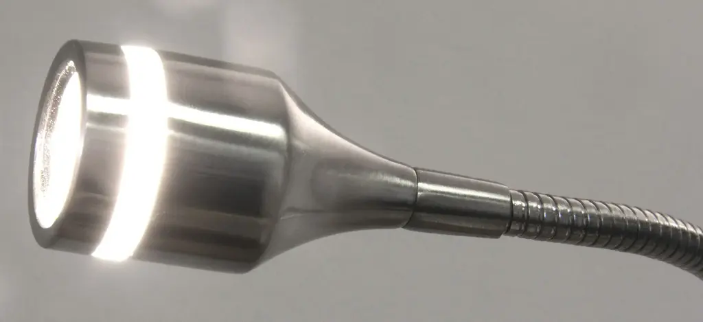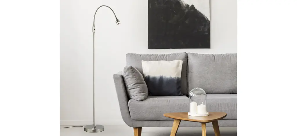 Save table or desk space with the Prospect LED floor lamp. The slim profile pumps out 250 lumens to illuminate any task, while the gooseneck extends the height or directs light where needed. The metal shade features a decorative light band accent and convex glass magnifier lens. Choose from versatile brushed steel or a matte black finish with a black fabric-covered cord. A rubber push switch located on the pole turns the lamp on and off. This lamp is smart outlet compatible. The LED light is integrated into the lamp and is not replaceable, but lasts 50,000 hours!