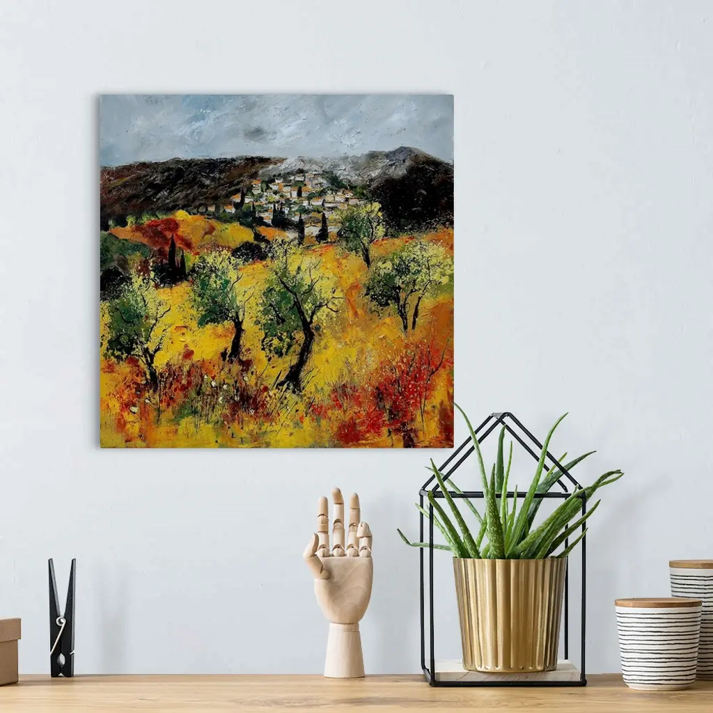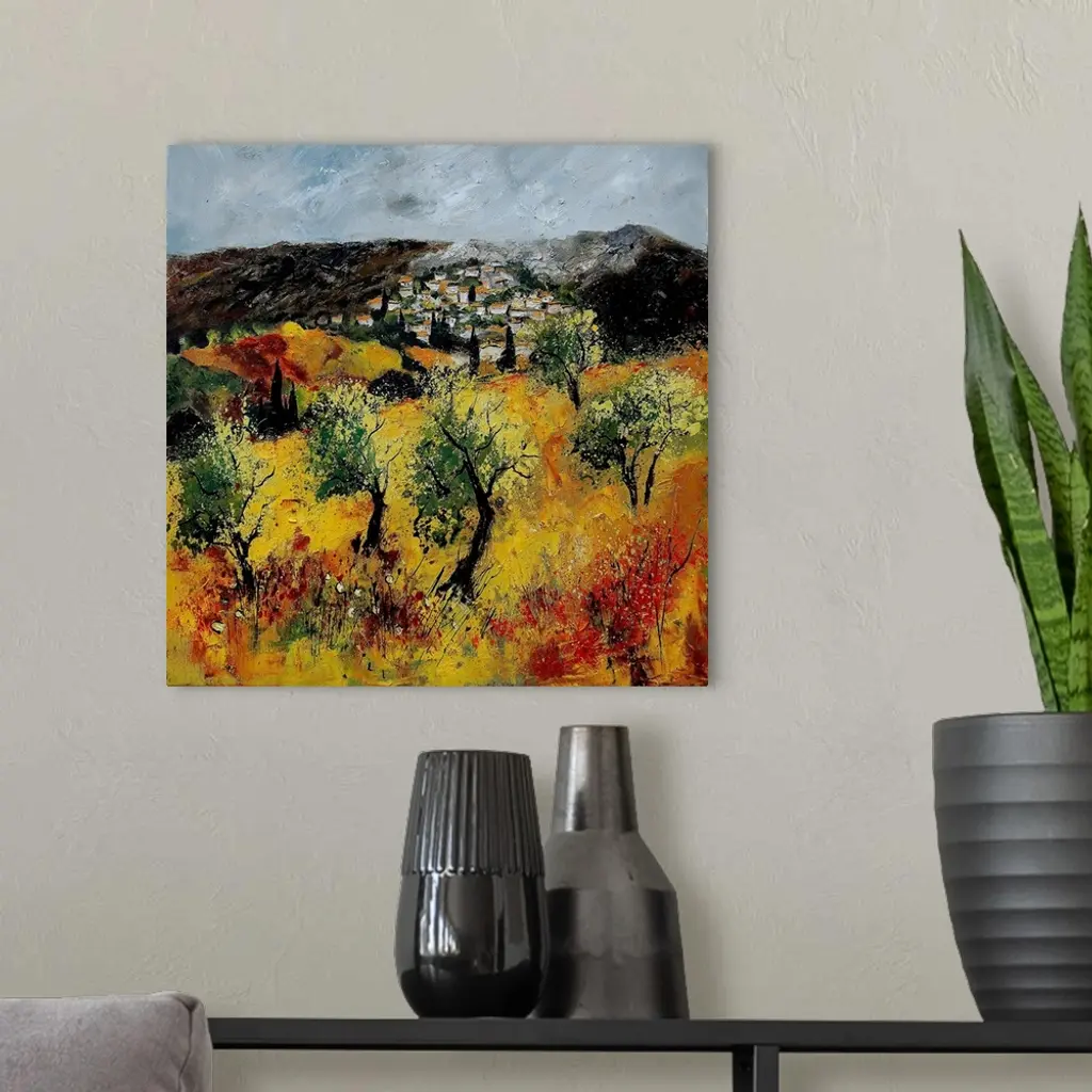 A horizontal abstract landscape of a village with muted textured colors of green, orange and yellow.