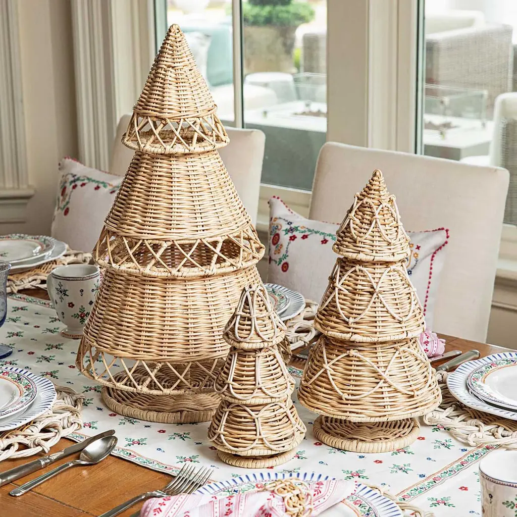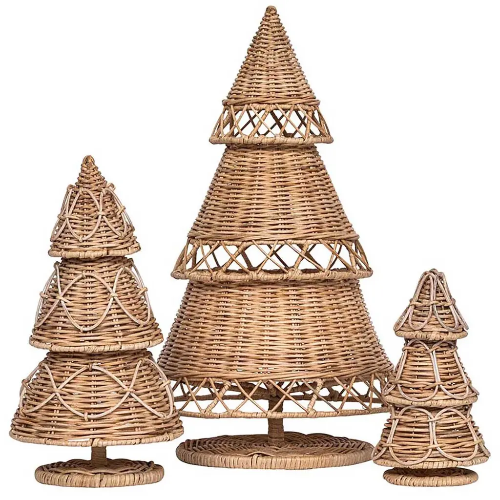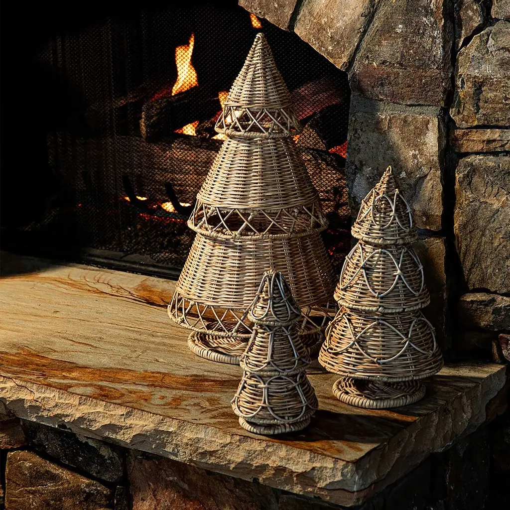 Create the magic of a winter wonderland with a fabulously unique forest of trees in beautifully hand-woven rattan. This statement-making spin on the classic evergreen is visually stunning, natural, and neutral for decorating indoor spaces with a festive sense of drama and an undeniable element of whimsy. When the season ends, this stacking set can be dismantled and nest together for easy storage. Decorate tables, shelves, and fireplace mantels with this chic spin on the traditional evergreen. This fabulously unique decorating piece infuses natural texture and warmth to any space and is especially striking when clustered with various sizes to create a festive forest that lasts all season long.