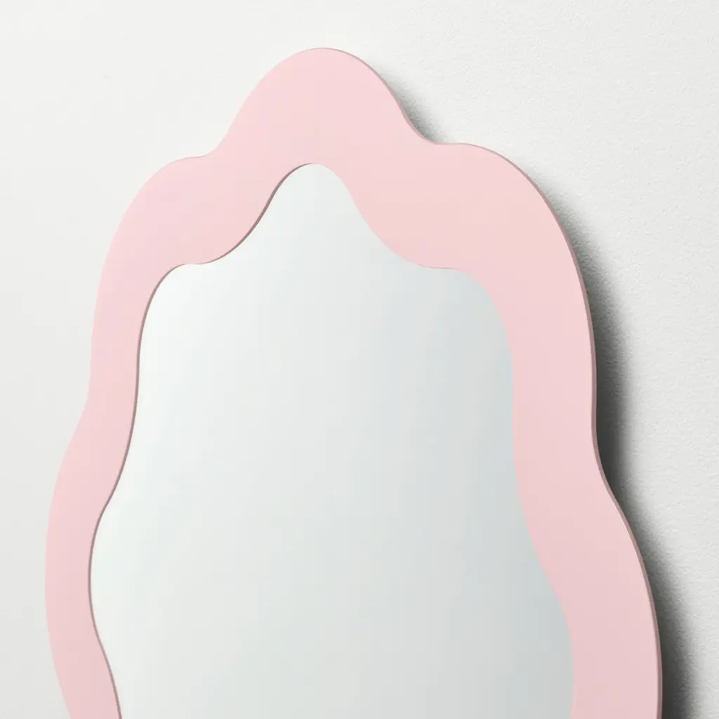 PRUNKHALLON Mirror - light pink 15 3/4 ". This mirror with a wave-shaped frame and vibrant color is both functional and decorative to put anywhere in the home. Two blocks on the back make the mirror slightly protrude out from the wall in a decorative way.