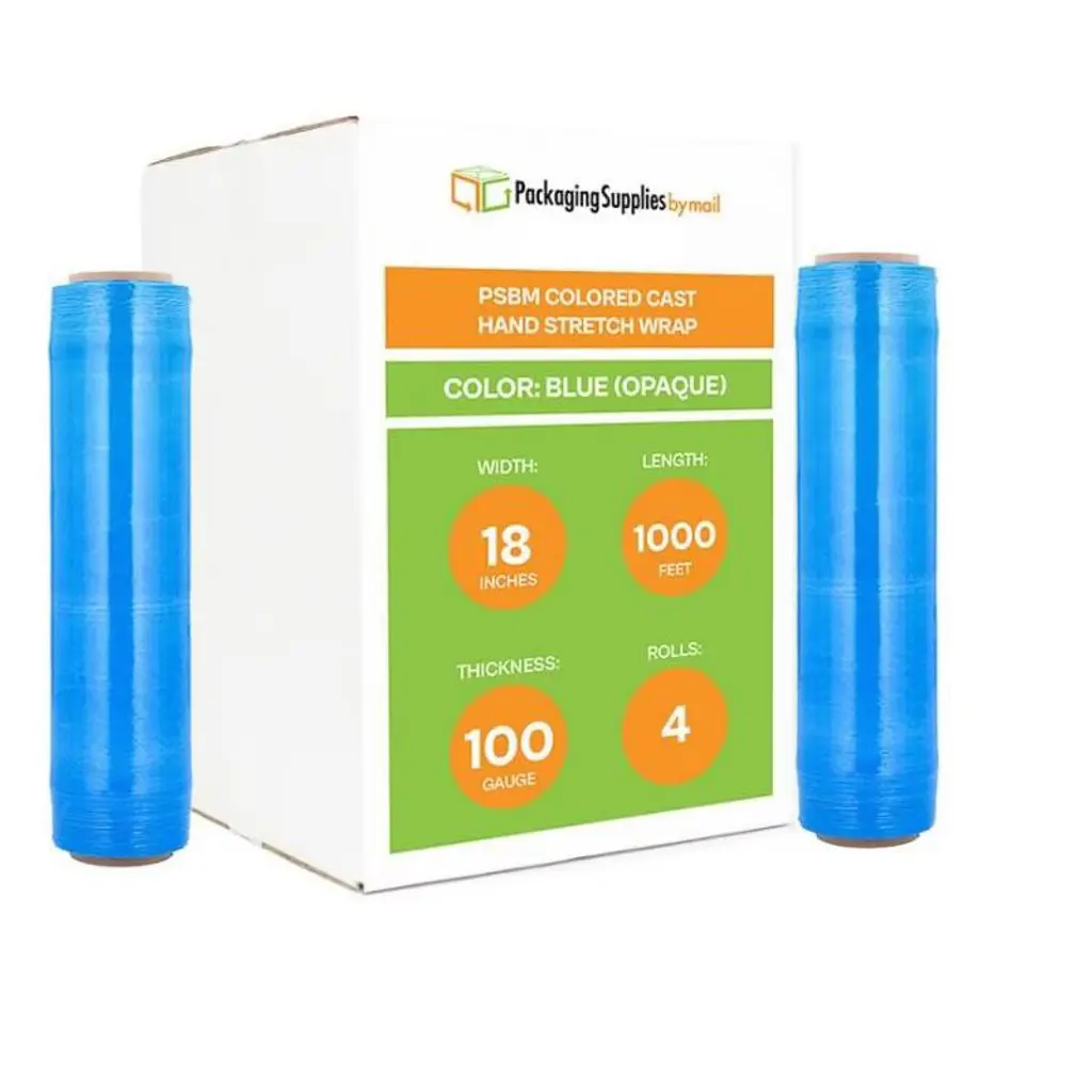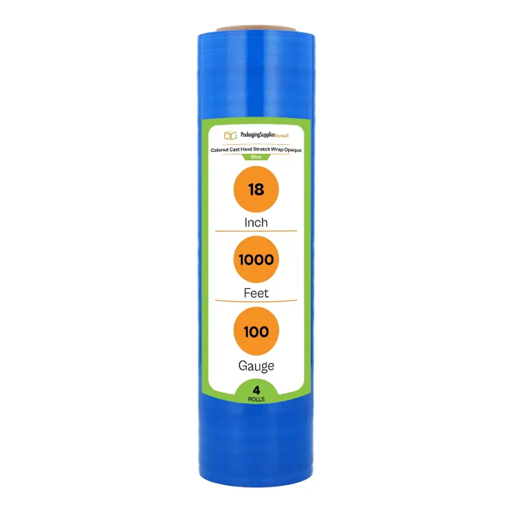 Dark (Opaque) and tinted color cast hand stretch wrap is designed to be wrapped tightly around goods, particularly those consolidated on pallets, to keep them secure during transport or storage. This elasticity not only allows for a tight hold on products but also helps in absorbing shock during movement, reducing the risk of damage. Its strength and durability make it resistant to punctures and tears, and its versatility makes it suitable for a wide range of applications, from securing boxes on pallets to bundling smaller items. The benefits of color cast hand stretch wrap are it can help identify specific shipments and can be a great way for businesses looking to brand their color scheme.