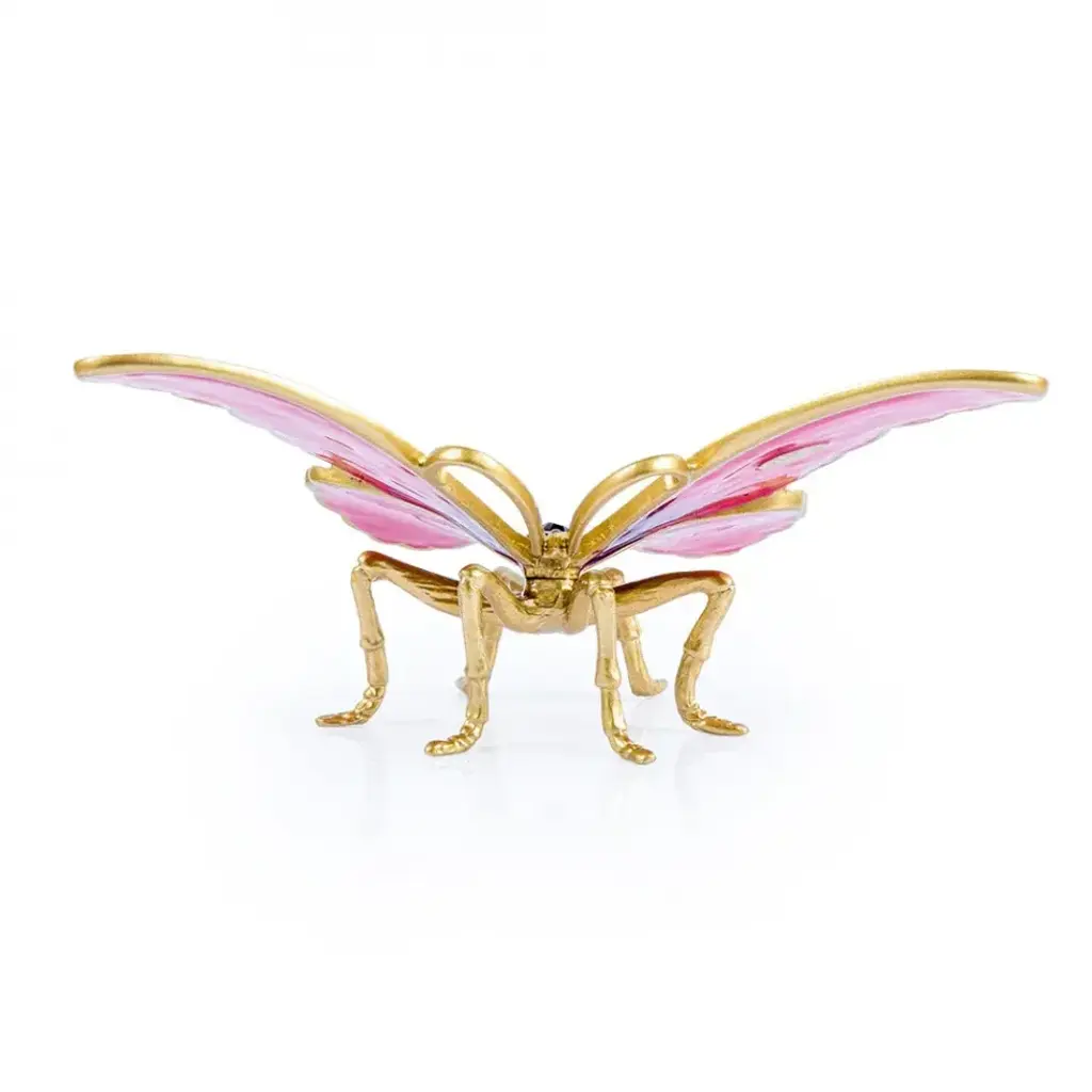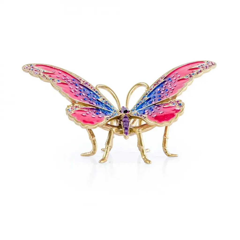 A jeweled fluttering butterfly to alight a tabletop anywhere in your home! Lifted on delicate metal legs, the Puccini butterfly’s wings are beautifully hand-painted in electric pink and cobalt blue enamels with hand-set European crystals in shades of rose and sapphire. Plated in 14K gold and detailed with a jeweler’s attention to crystal stone setting.
