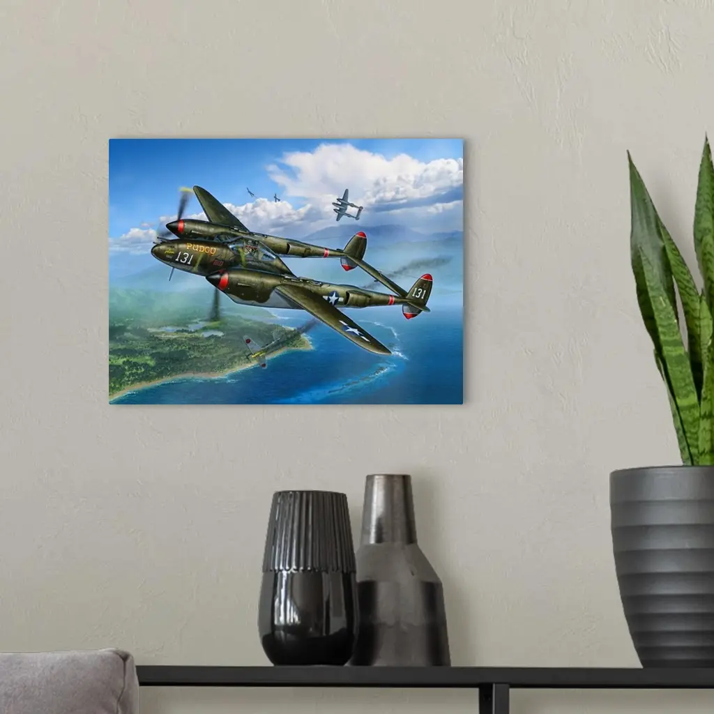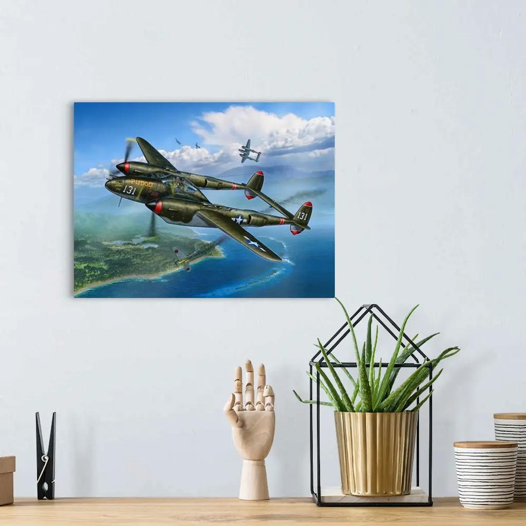Tomas McGuire guides his famed P-38 Lightning "Pudgy" to another victory over a South Pacific island in 1943.