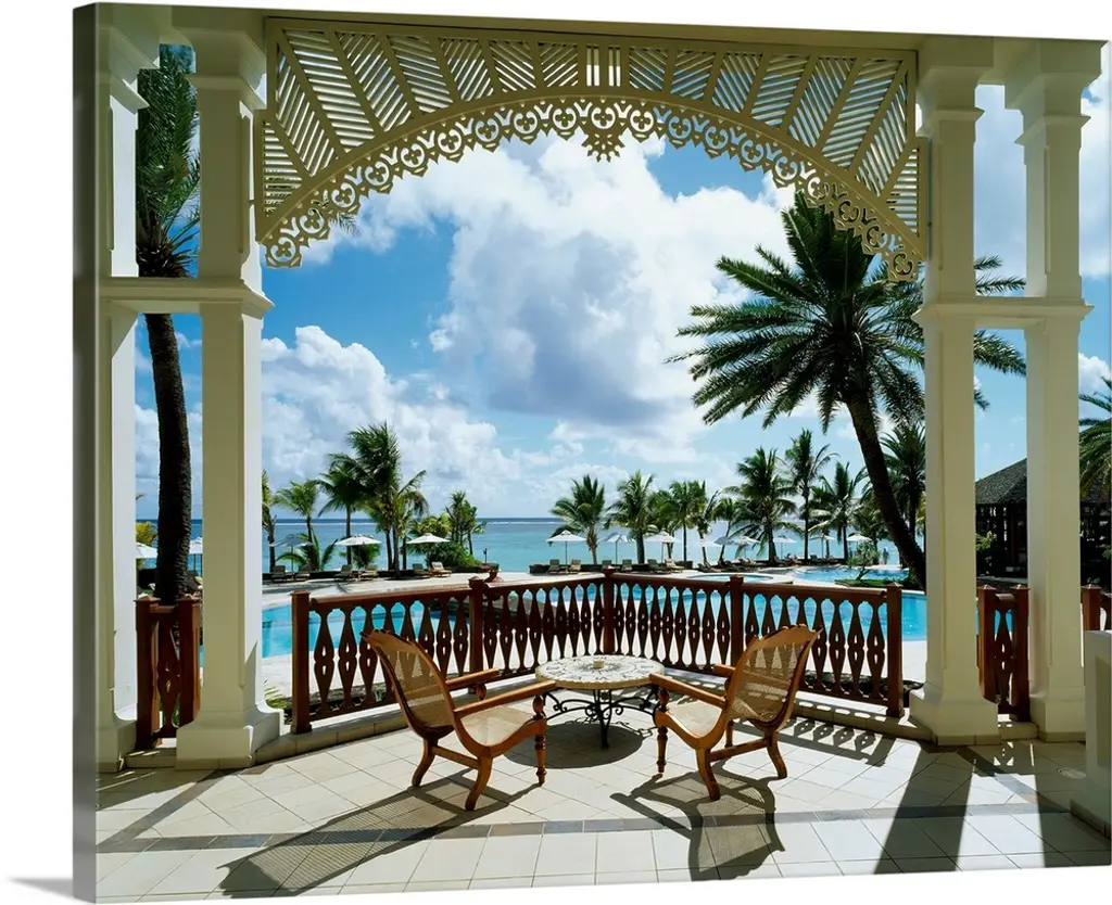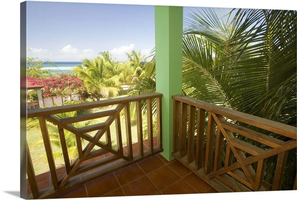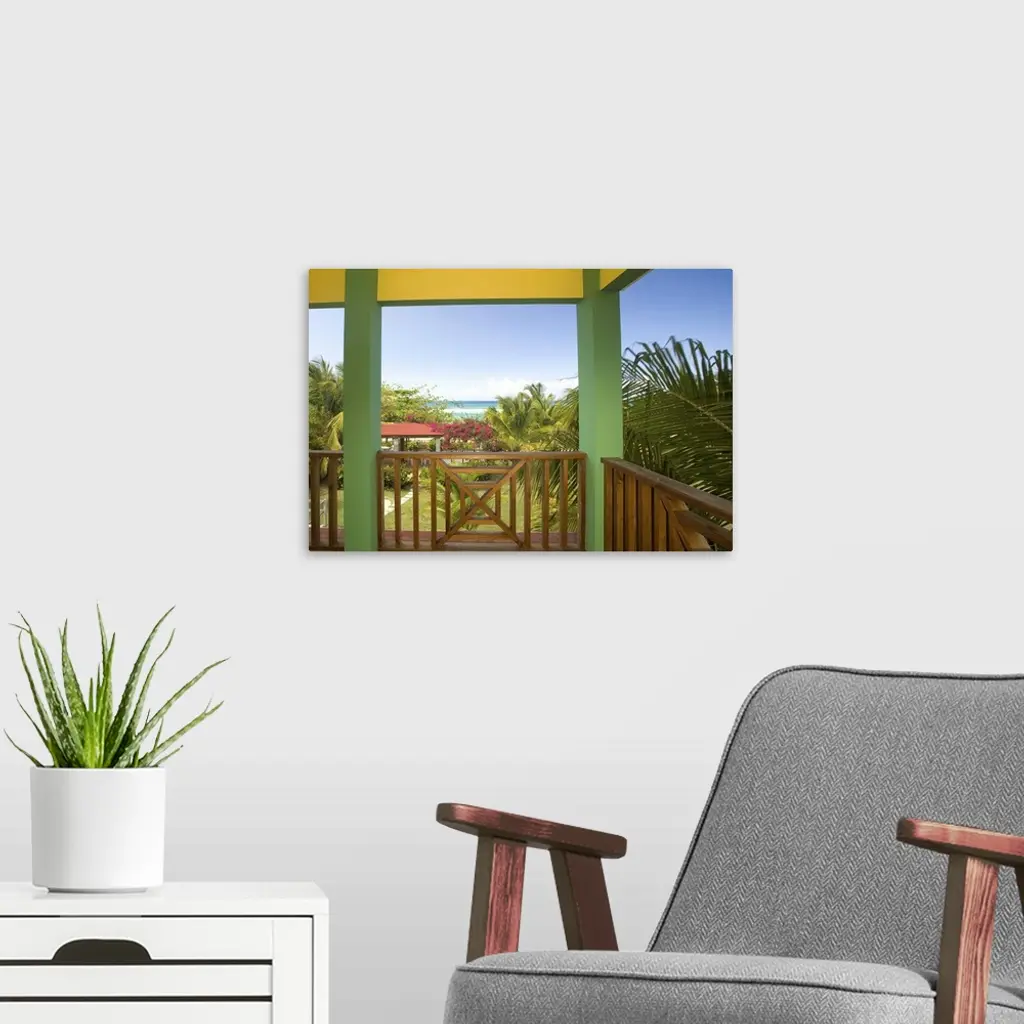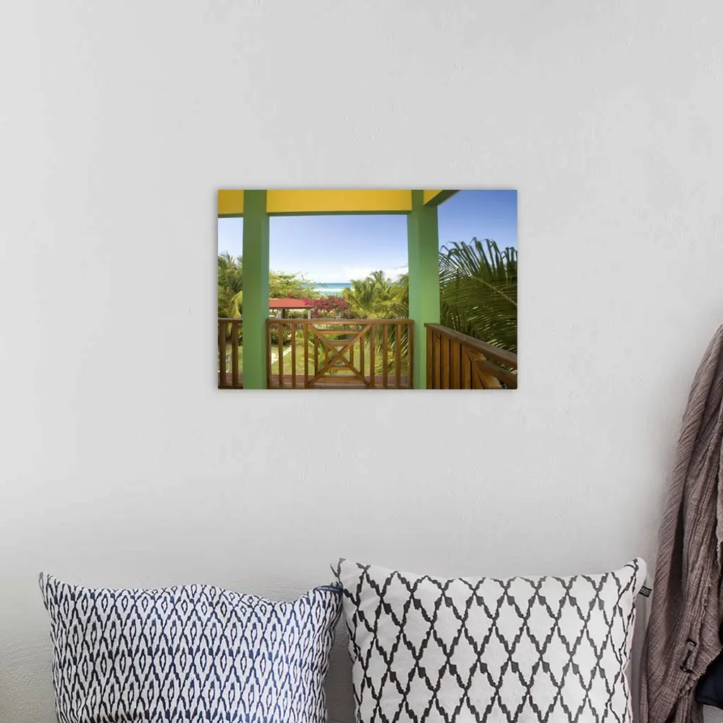 Caribbean, Puerto Rico, Vieques. Caribbean, beach and palm trees, viewed from porch of house/hotel. PR
