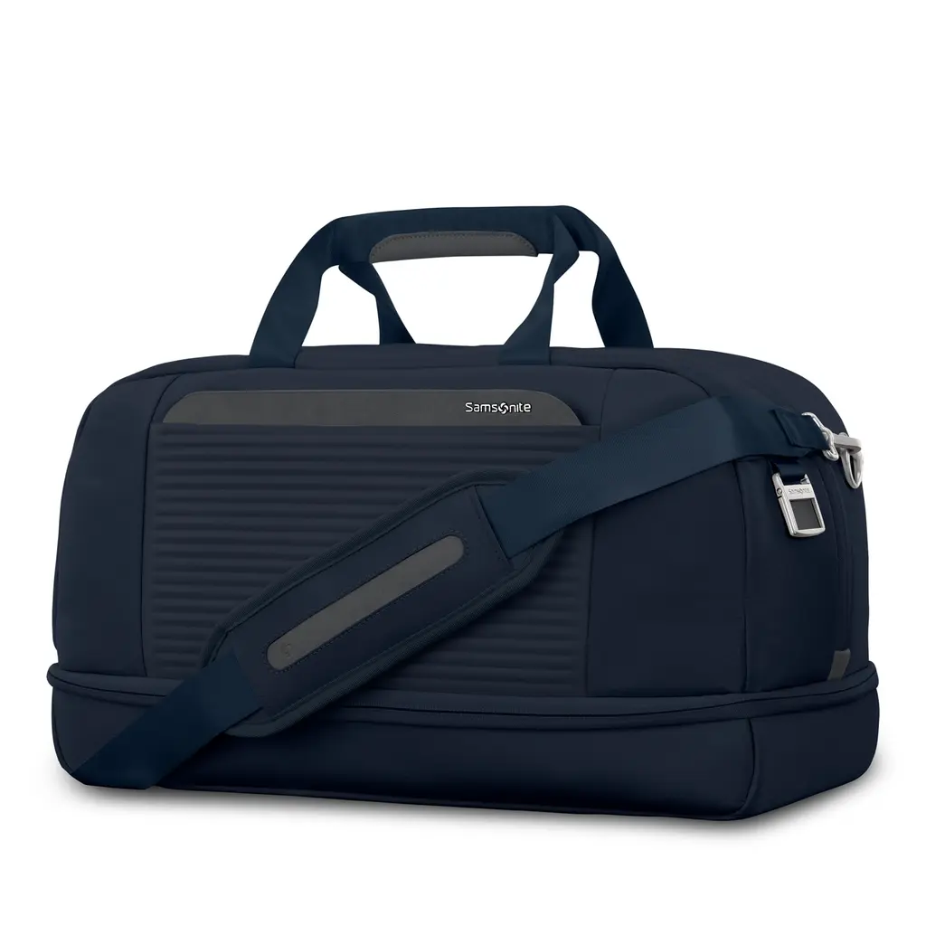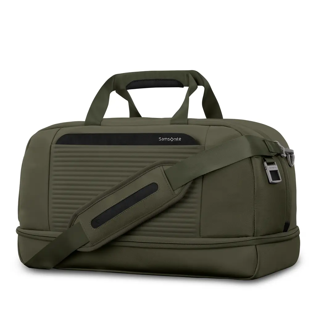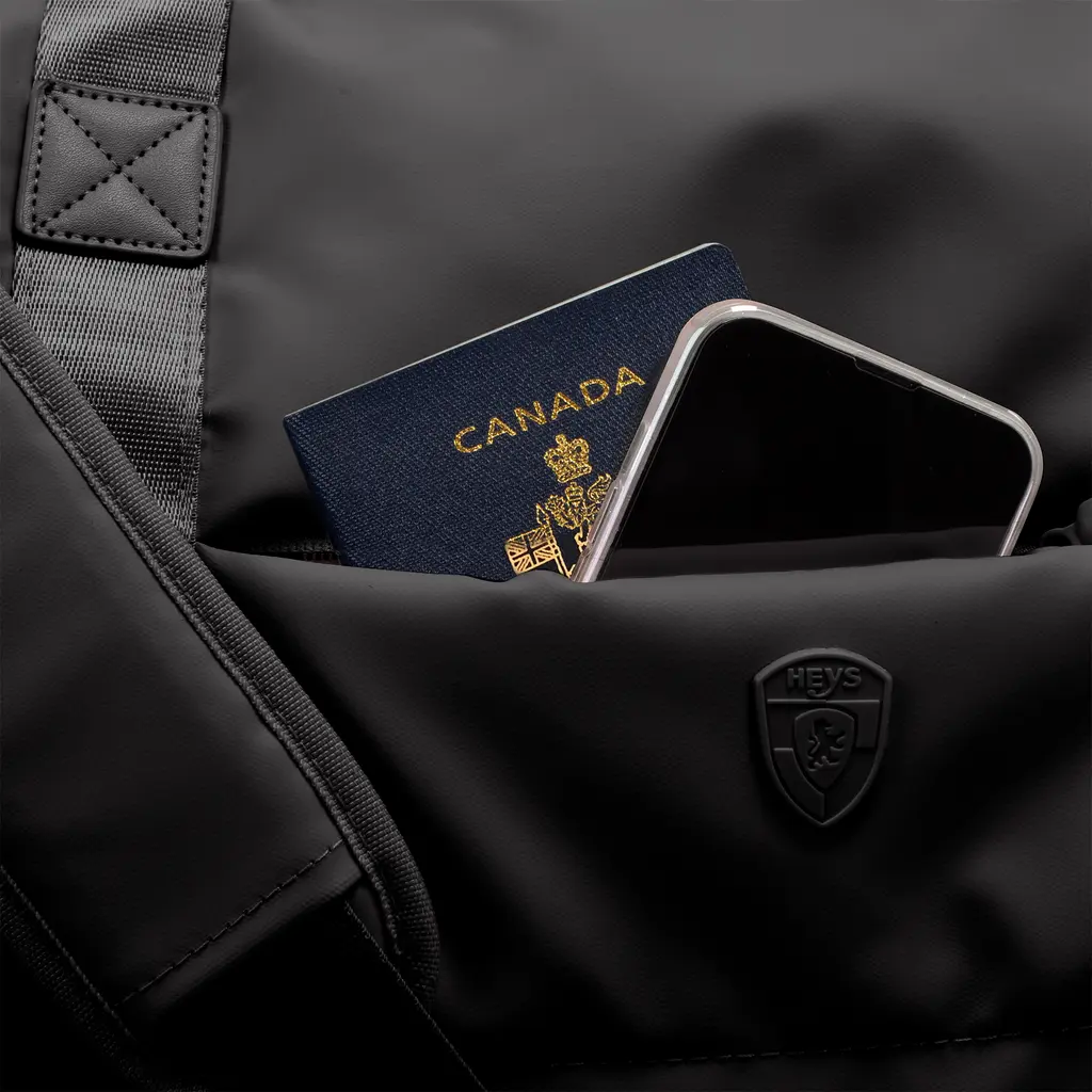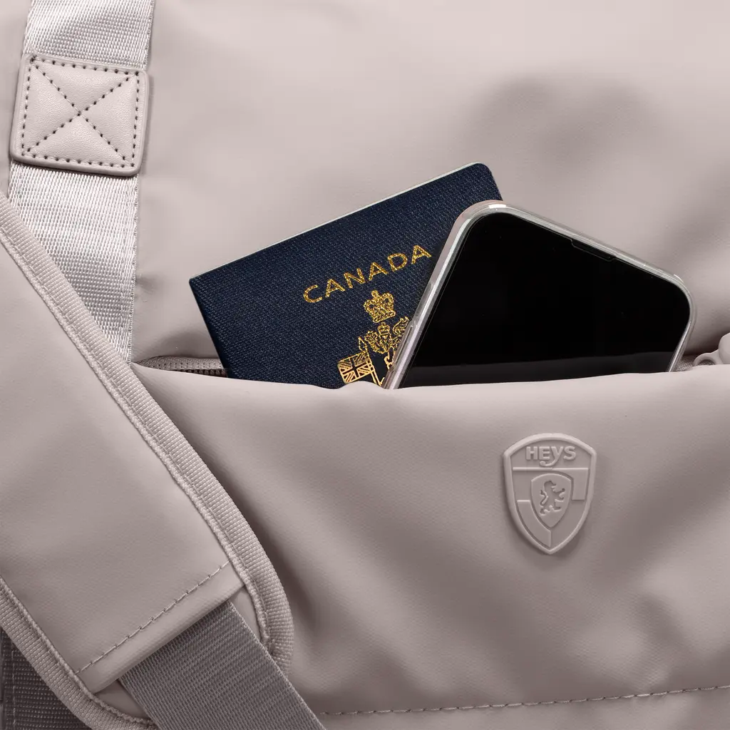 Your must-have travel essential for gym sessions, weekend getaways, and effortless carry-on travel convenience, the Heys Puffer duffel is designed for those who crave both style and functionality. Crafted from luxuriously soft, lightweight, water-resistant fabric, this bag seamlessly blends premium quality with smart, travel-ready design. Available in stunning shades, this duffel isn't just practical: it's a bold statement. Its spacious interior, dedicated shoe compartment, dual exterior water bottle pockets, and camouflaged front zipper pocket ensure your essentials stay organized, whether you're hitting the gym or heading out on an adventure. Additional features include dual zip closures, durable handles with matching hardware, and three convenient carrying options—side, top, or shoulder—with a detachable/adjustable nylon strap. The slide-through trolley pocket makes it easy to pair with your luggage for seamless airport navigation.