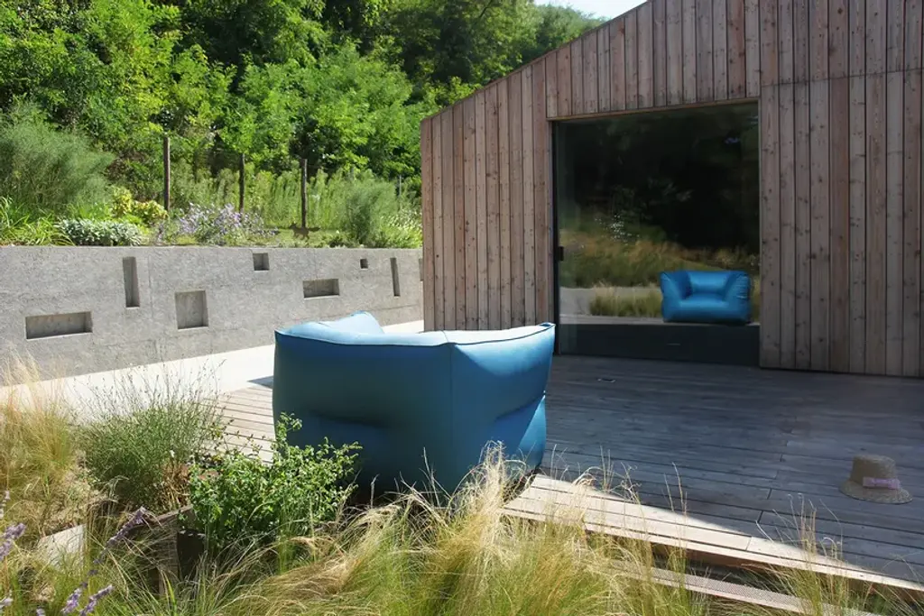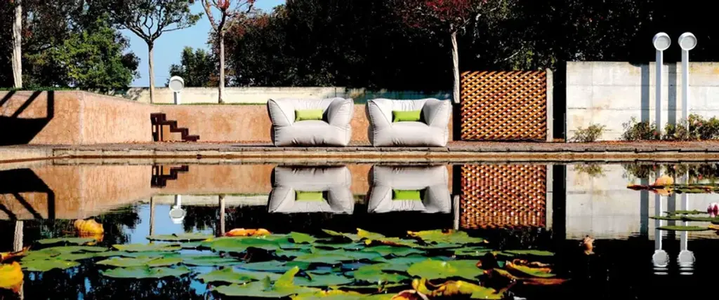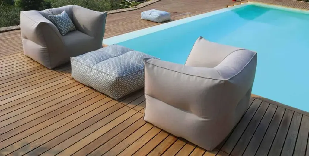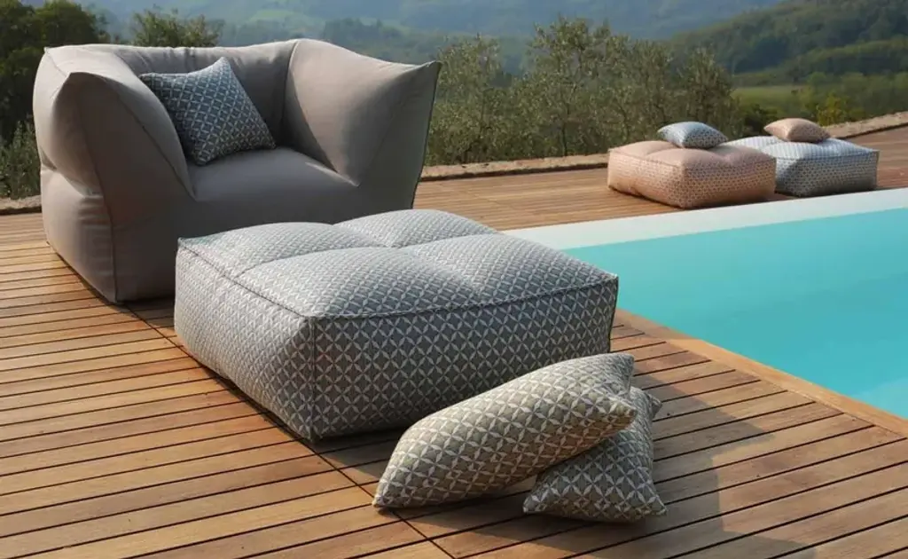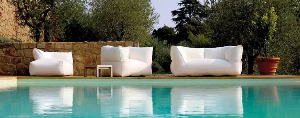 Puffone is a fabric garden armchair.Non-removable cover.Made of fabric.Fabrics: Sling Basic, Sling Extra, Heritage, Lopi, Domino, Siesta, Fortezza, Salina, Elios, Plain Velour, Premier, GlamSofas, armachairs and chaise longue - classic, angled, with arms- and pouffes of different sizes. What joins them is a high level of comfort. Attractive and sinuous shapes are meant to restore you. Ergonomics with no structure and only high quality textiles that cover the tiny polystyrene spheres.