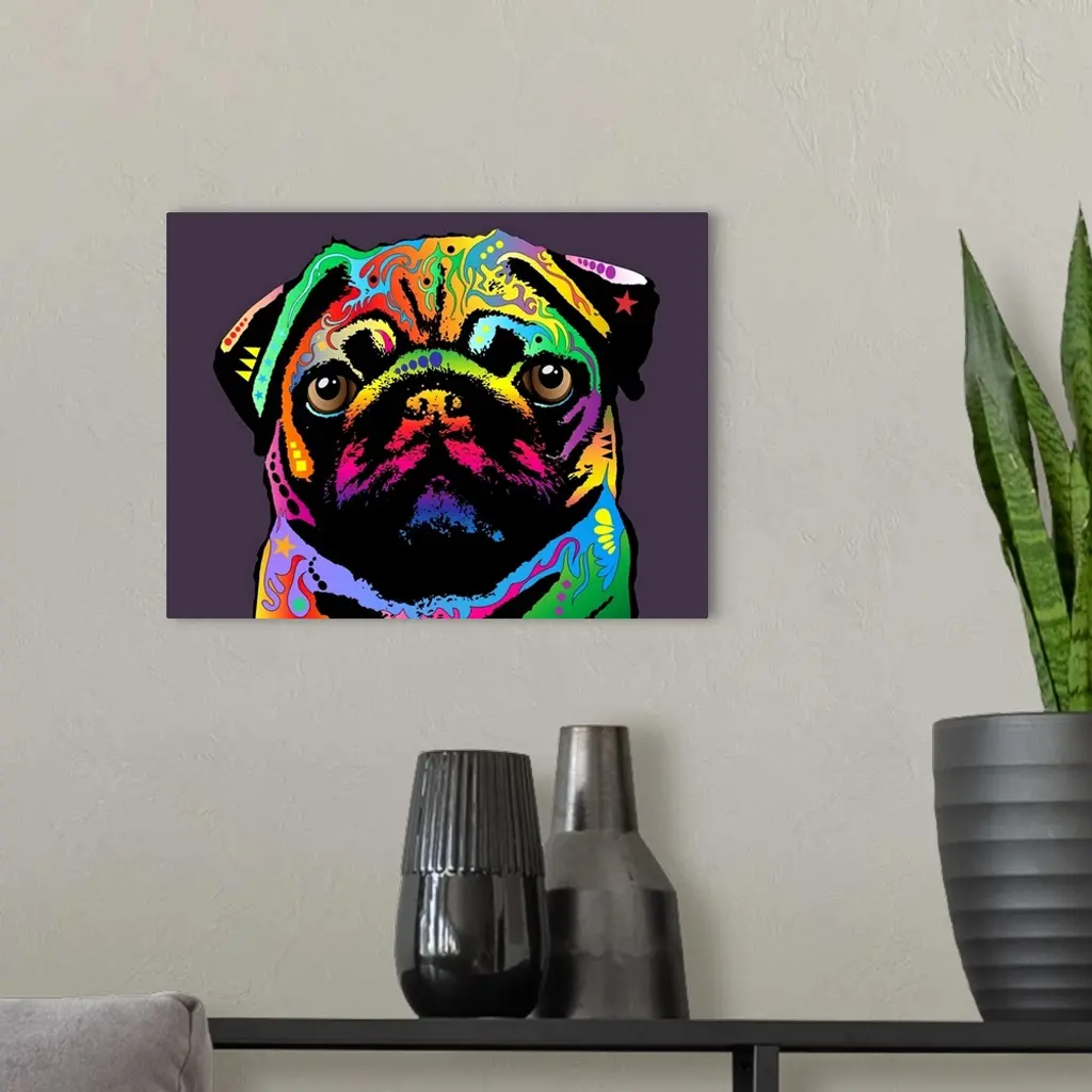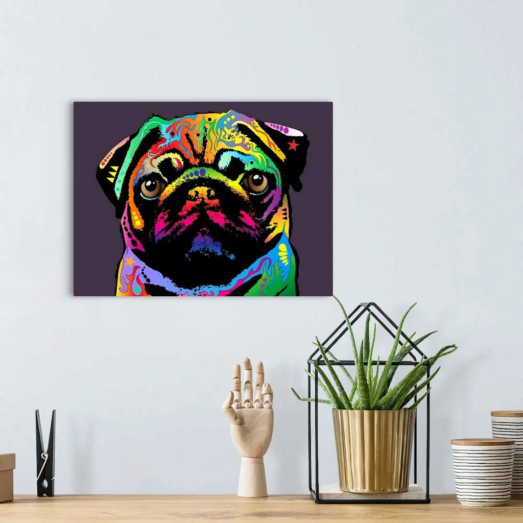 Pug Art Print Canvas. The pug is a toy breed of dog with a wrinkly, short-muzzled face, and curled tail. The pug breed has a fine, glossy coat that comes in a variety of colors, and a compact square body with well-developed muscle. Pugs were originally bred to adorn the laps of the Chinese sovereigns during the Shang dynasty (before 400 BCE) in East China. The pug was imported to Europe in the 16th century by the Dutch East India Company. The pug is said to have become the official dog of the House of Orange in 1572 after a pug named Pompey saved the life of the Prince of Orange by alerting him to the approach of assassins.