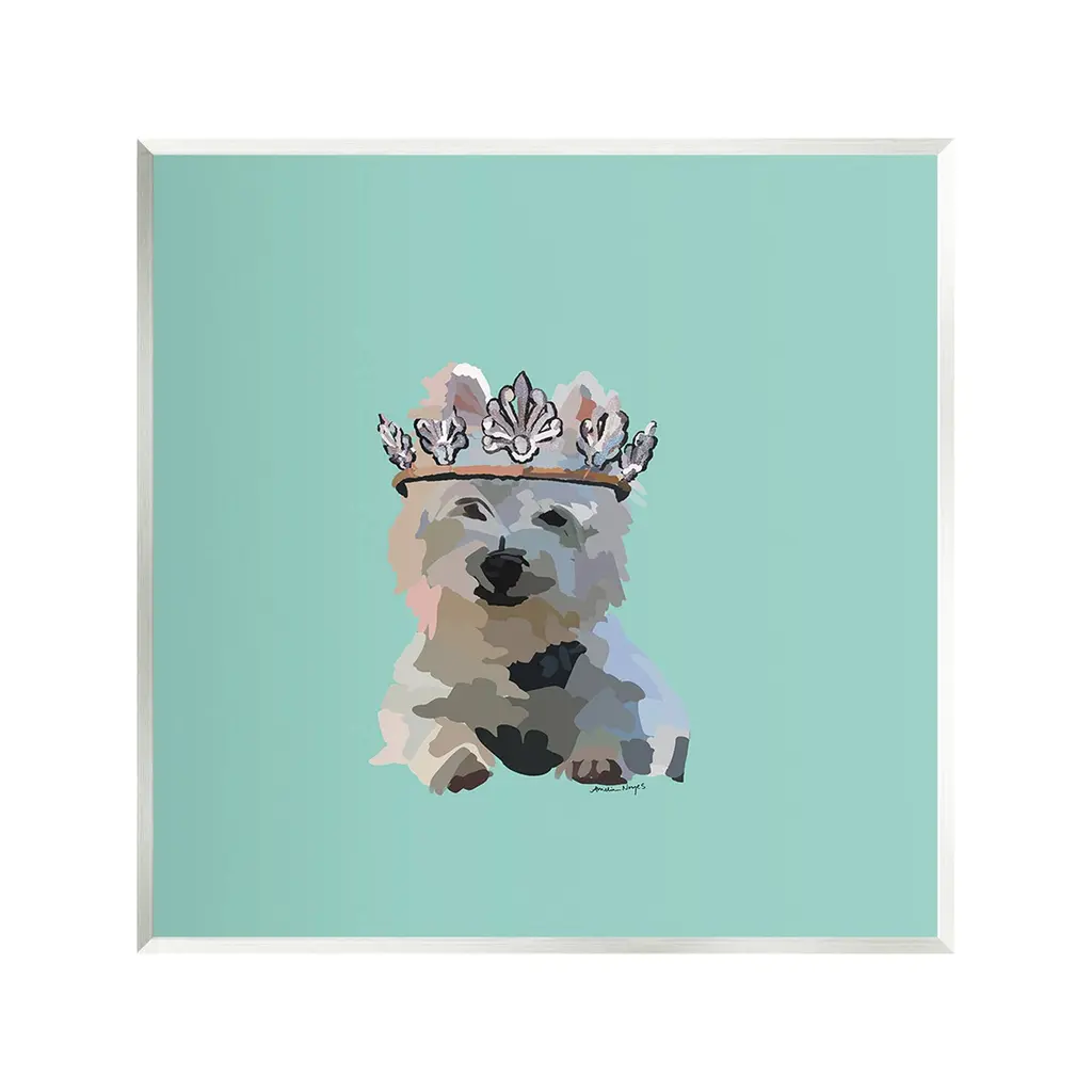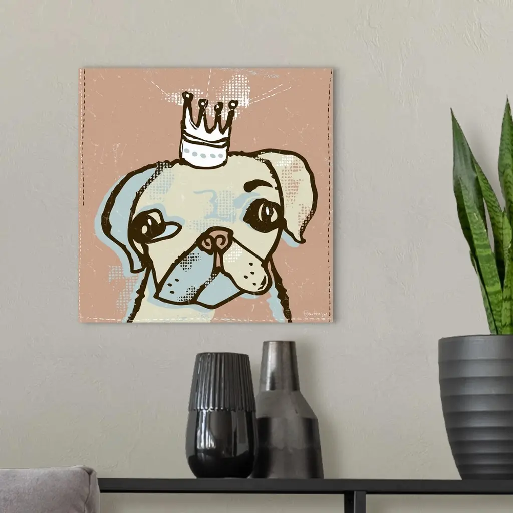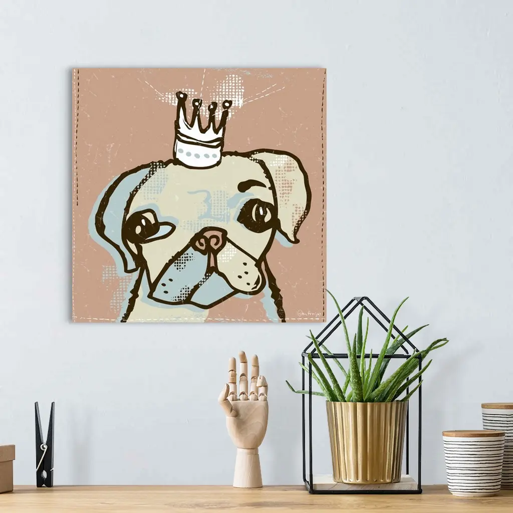 A domesticated pug dog or boston terrier with a crown on his head called top dog.
