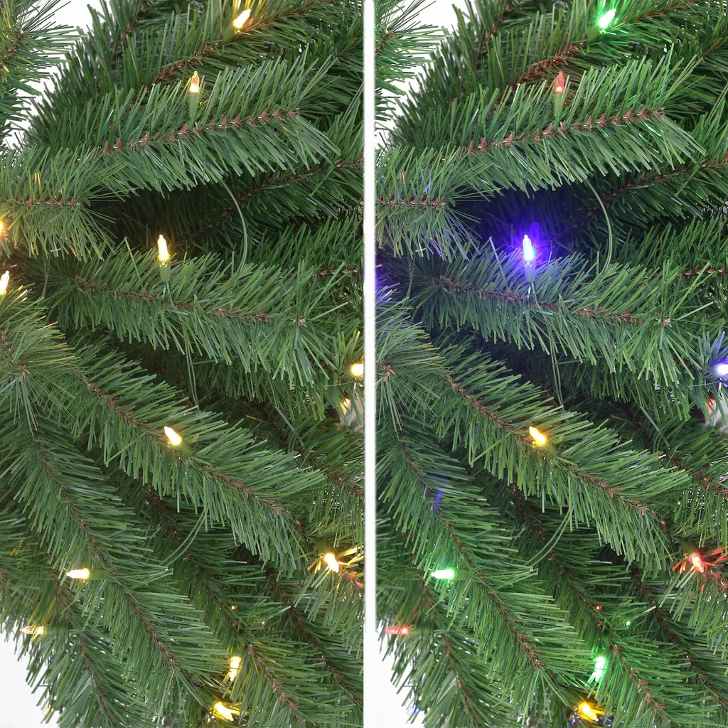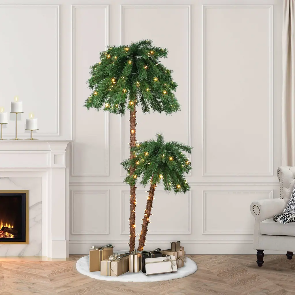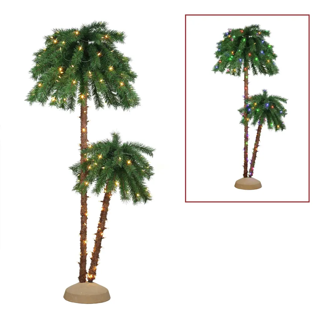 Bring your vision of a tropical paradise to life with the Puleo International Pre-Lit Artificial Double Trunk Palm Tree with 175 Dual Color LED Lights. No matter where you live, you'll always feel like you're having fun in the sun with this 6 ft & 3.5 ft Double Trunk Palm Tree. Get the party started and display this decorative indoor or outdoor tree in your lawn, on your patio, poolside, or even inside your home or walkways as a fun tropical twist on a classic Christmas tree. Featuring 105 branch tips and a 3.5-foot second trunk extension for a full and realistic effect, you'll be fully convinced that you're on the sandy shores of the beach from the comfort of your own home. Lit with 175 pre-attached Dual Color LED lights, you can select either Clear or Multi-color lights with the flip of a switch. With a perfectly balanced base made of durable materials including resin and MGO2, you can enjoy your festivities knowing that this tree is both sturdy and flame-retardant. This product is backed by a one-year warranty on the tree. Features: