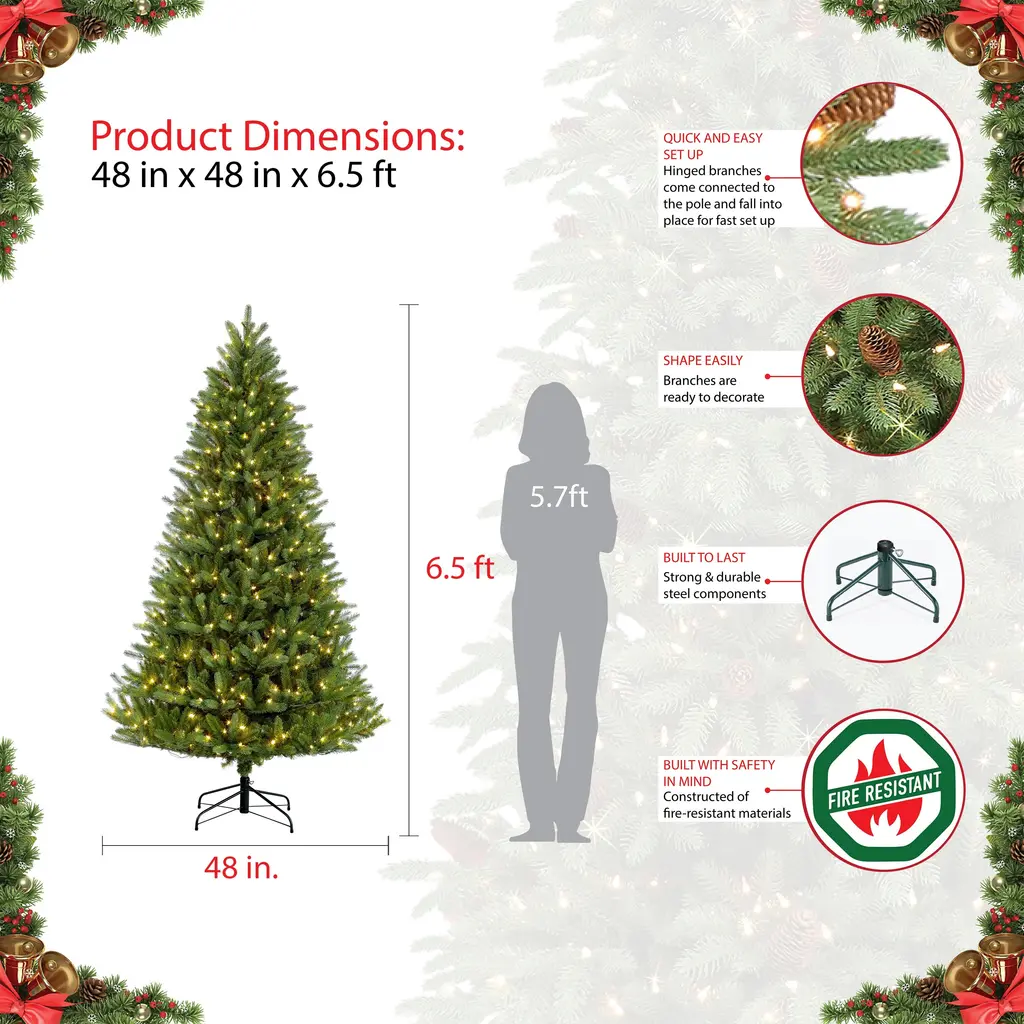 Deck the halls with the Puleo International 6.5-Foot Glacier Fir Tree. Inspired by lush wintry forests, this artificial tree has 1283 branch tips (410 PE and 873 PVC) and 500 Incandescent Clear Lights. The incorporated lights mean no more climbing ladders to string lights, saving decorating time. When a single bulb burns out, the other lights on the strand will stay lit for your convenience. Hypoallergenic and needle-shed resistant, the tree is a great alternative to a yearly real tree purchase. With easy to assemble pieces and an included base, your house will be ready for the holidays faster than you can say "Rockin' Around the Christmas Tree". Measures 6.5 Foot High x 48 Inch Diameter. 37 Lbs.