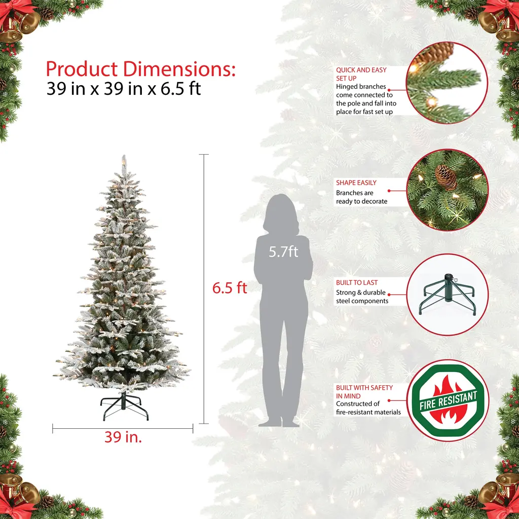 Bring winter wonderland vibes to your home with the Puleo International 6.5-foot Pre-Lit Slim Flocked Aspen Fir Artificial Christmas Tree. With 760 branch tips and 350 Incandescent Clear Lights, this tree offers a lush and dazzling display that saves you time on decorating. Its hypoallergenic and needle-shed resistant features make it an ideal option for those with allergies or who prefer a low-maintenance tree. The easy-to-assemble pieces and included base ensure that your house will be holiday-ready in no time. Measures 6.5 feet high x 39 inches in diameter and weighs 30 lbs.