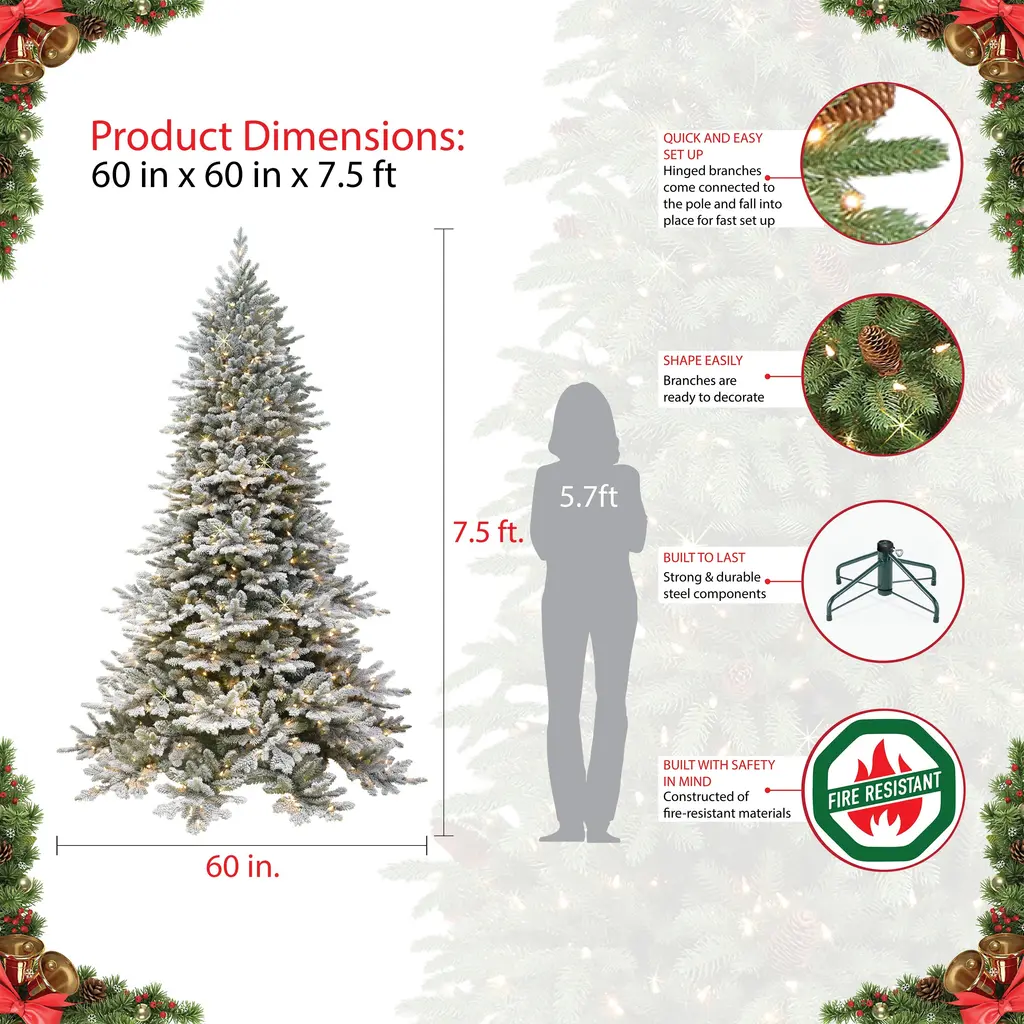 Bring the holiday spirit into your home with the Puleo International 7.5' Slim Flocked Royal Majestic Douglas Spruce Artificial Christmas Tree. This pre-lit artificial tree features hinged branches, flocked, downswept branches and 500 clear incandescent lights to brighten your home for a dazzling Christmas display. With life-like pine needles and a realistic appearance, this green tree is sure to add warmth to any room or space for years to come. The included sturdy metal base will safely and steadily support your tree and decorations. Plus, if one bulb burns out, the rest remain lit. Constructed from flame-retardant and non-allergenic materials, this tree provides a safer alternative to real trees. The Royal Majestic Douglas Spruce Tree with 500 lights measures 90" tall x 48" in diameter and weighs 42 lbs., allowing for easy placement and versatile Christmas decorating anywhere in your home.