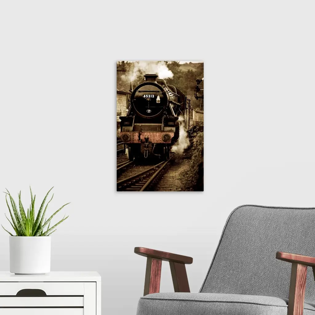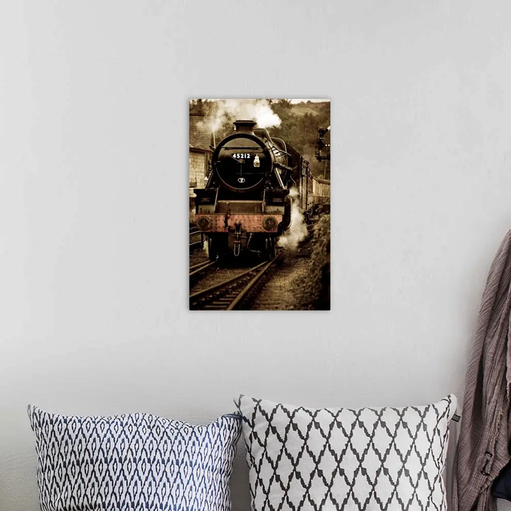 Photograph of front view of locomotive on tracks blowing smoke and pulling into station, with it's train cars trailing in the distance.
