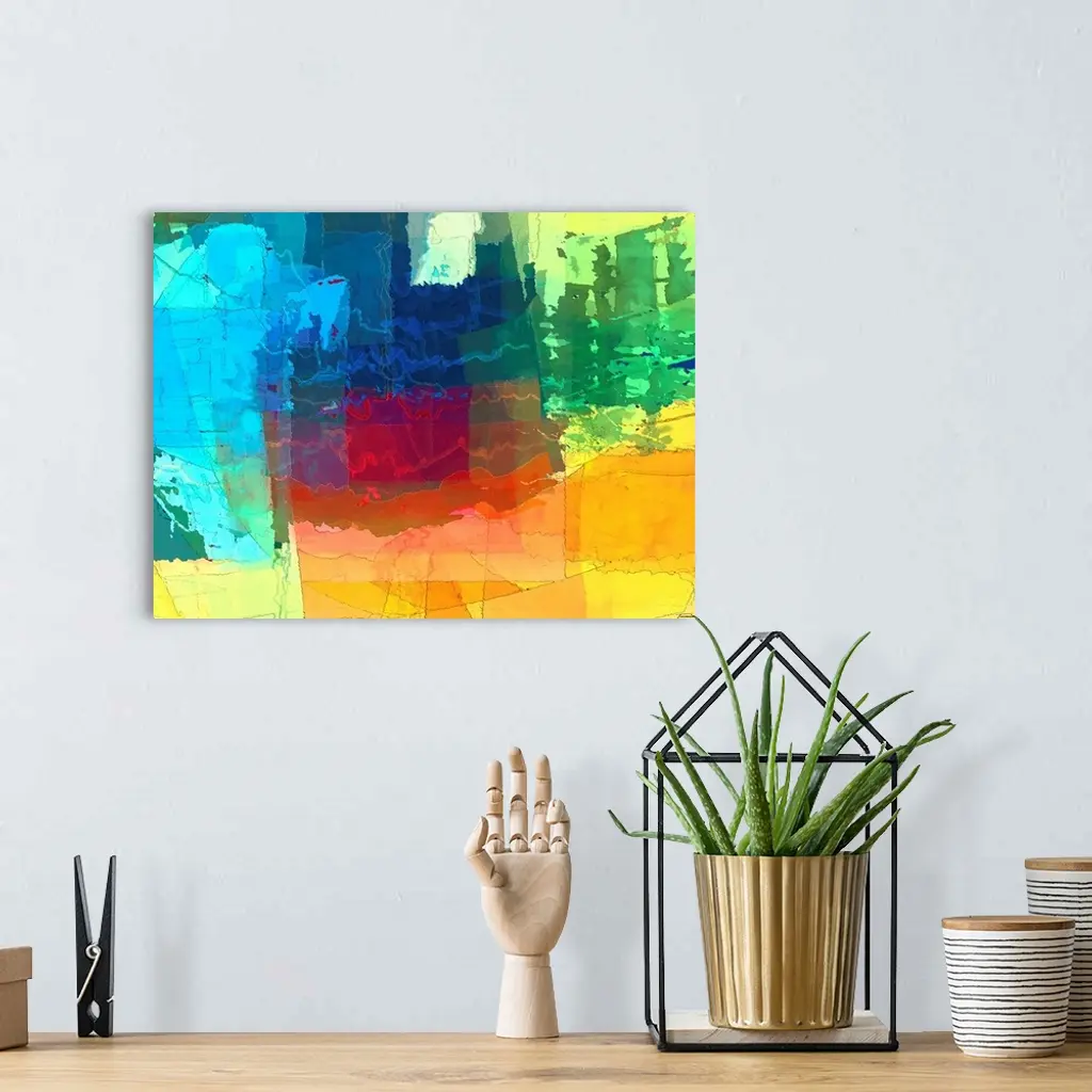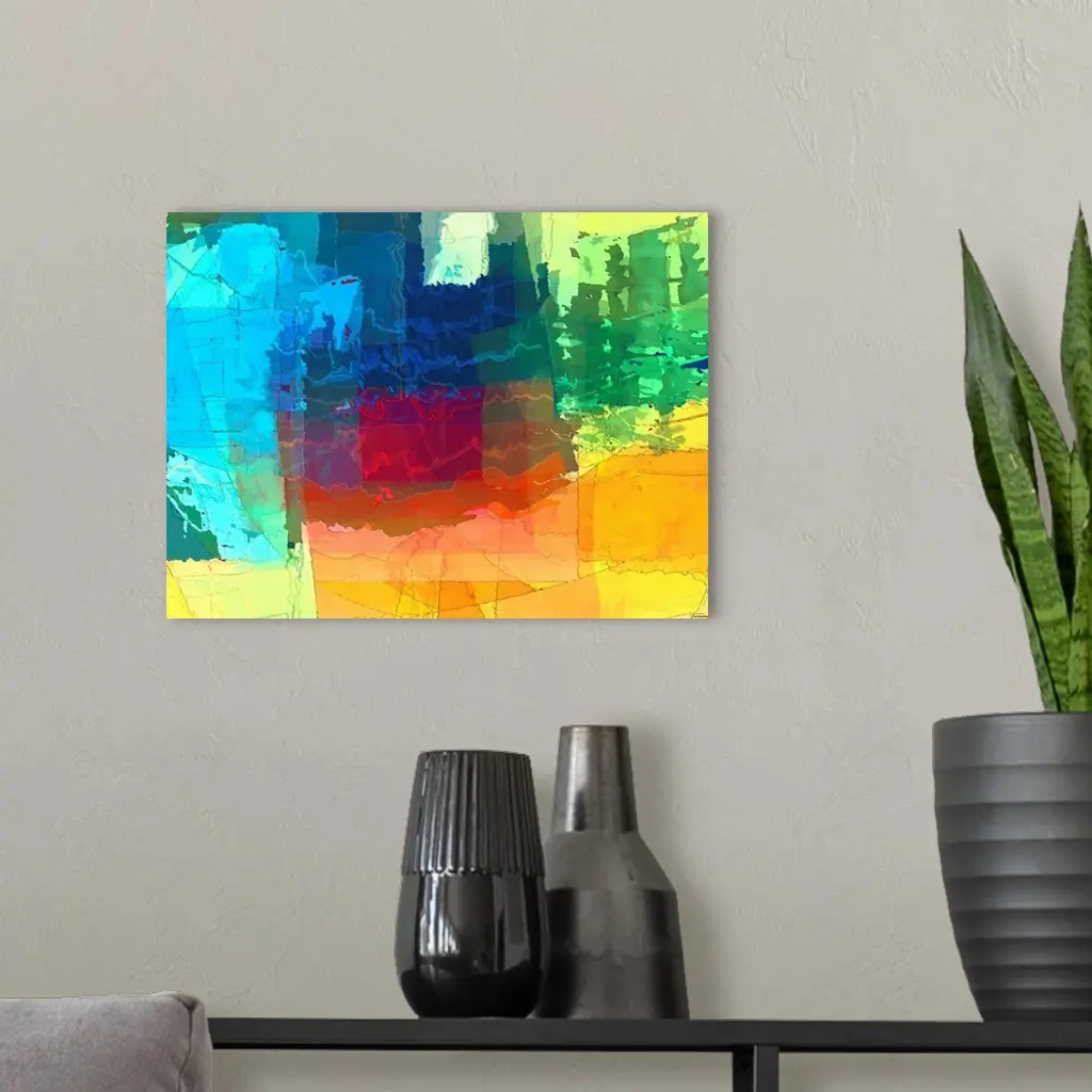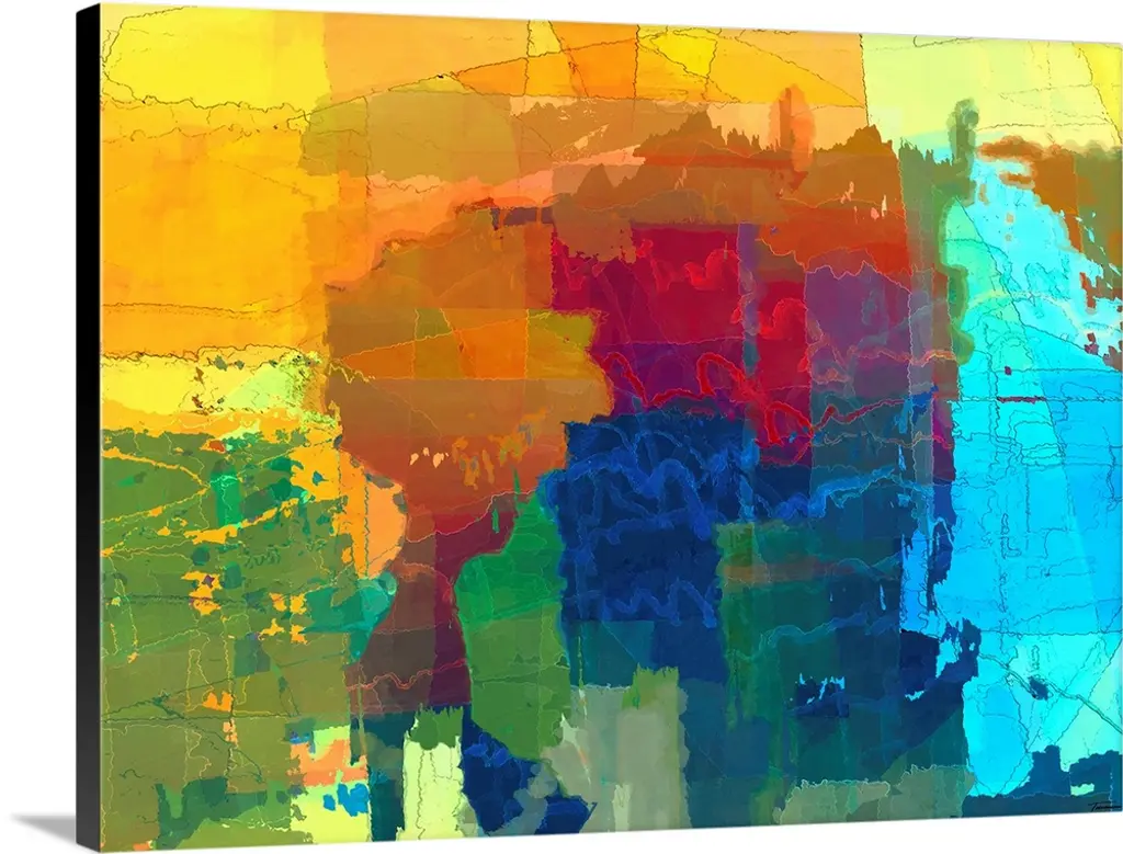 Vibrant abstract art with translucent hues layered on top of each other in different free formed shapes.