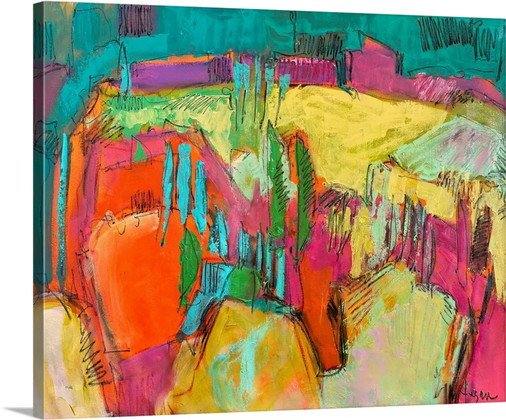 Vibrant abstract art with translucent hues layered on top of each other in different free formed shapes.