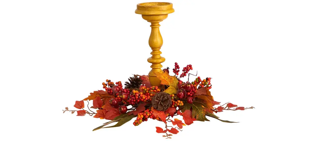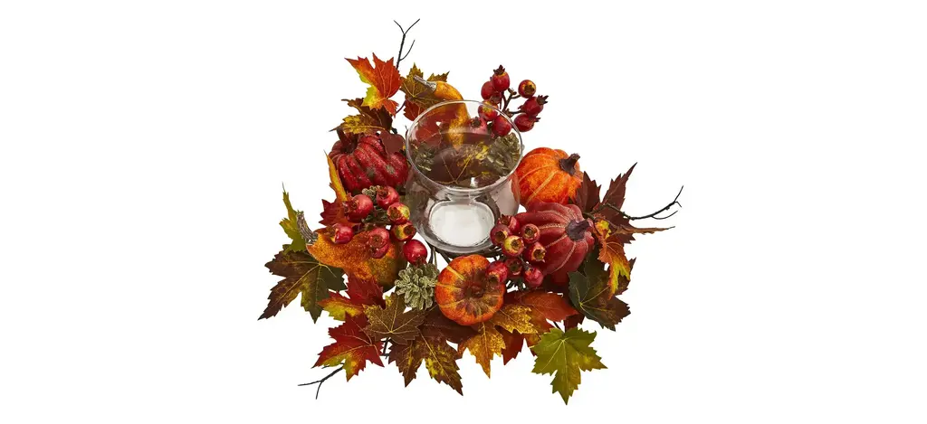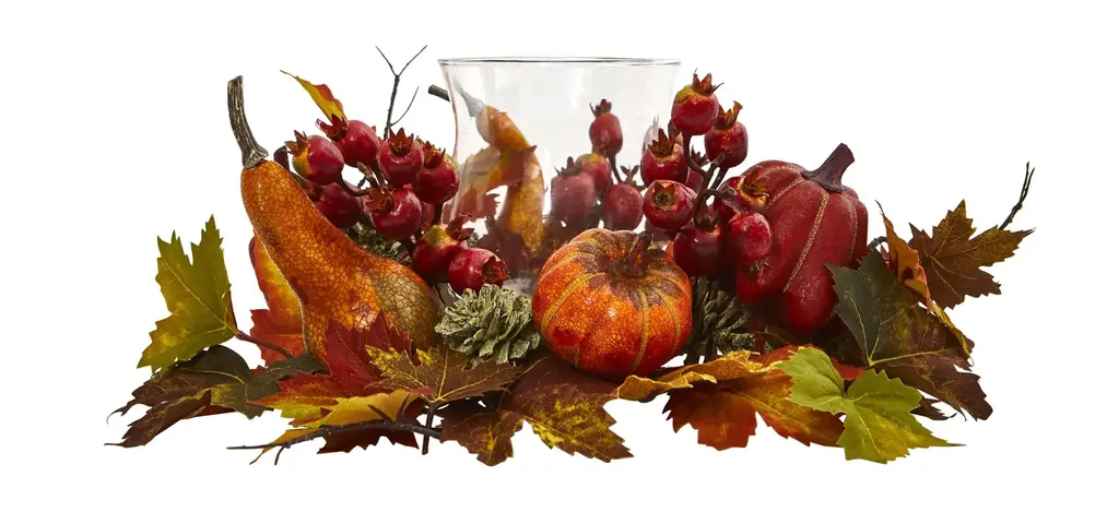 Replace last season's candles with this gorgeous pumpkin, pine cone, and berry Fall Themed Candelabrum. With lovely artificial leaves and yellow squashes surrounding a clear candleholder, you'll bring some of nature's autumn splendor indoors.