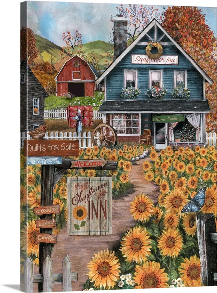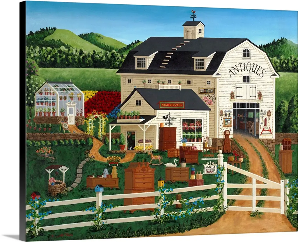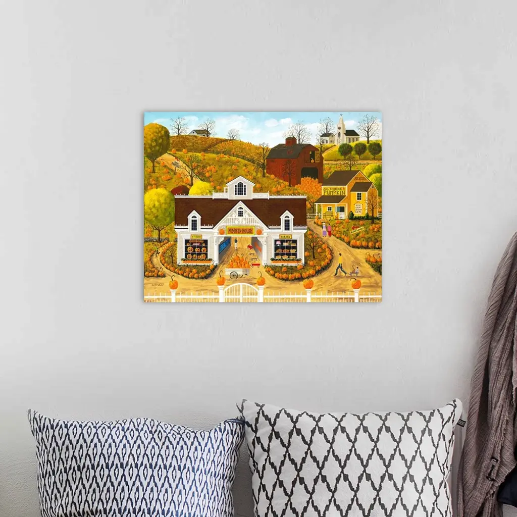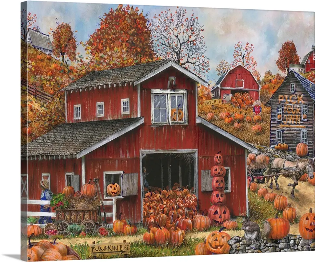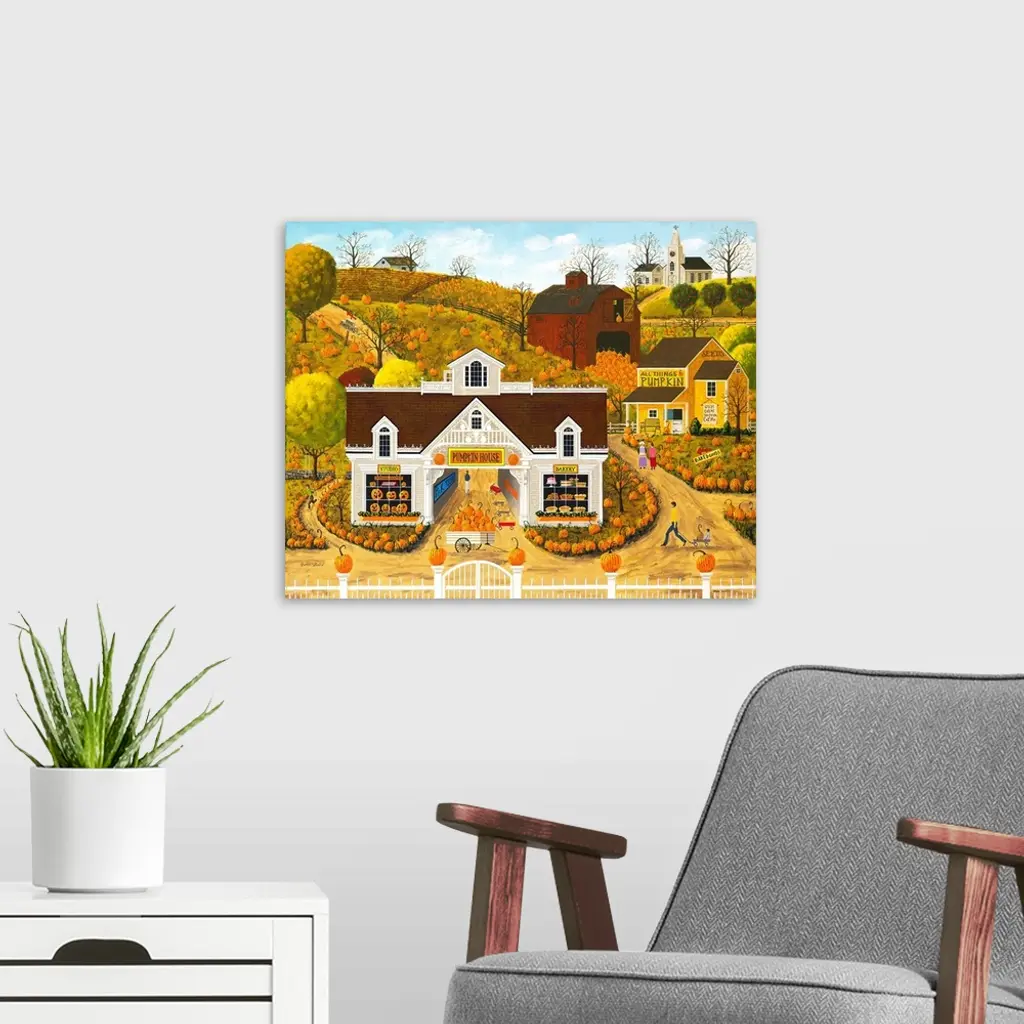 Americana scene of a farm selling pumpkin goods including carving pumpkins, pies, and seeds.