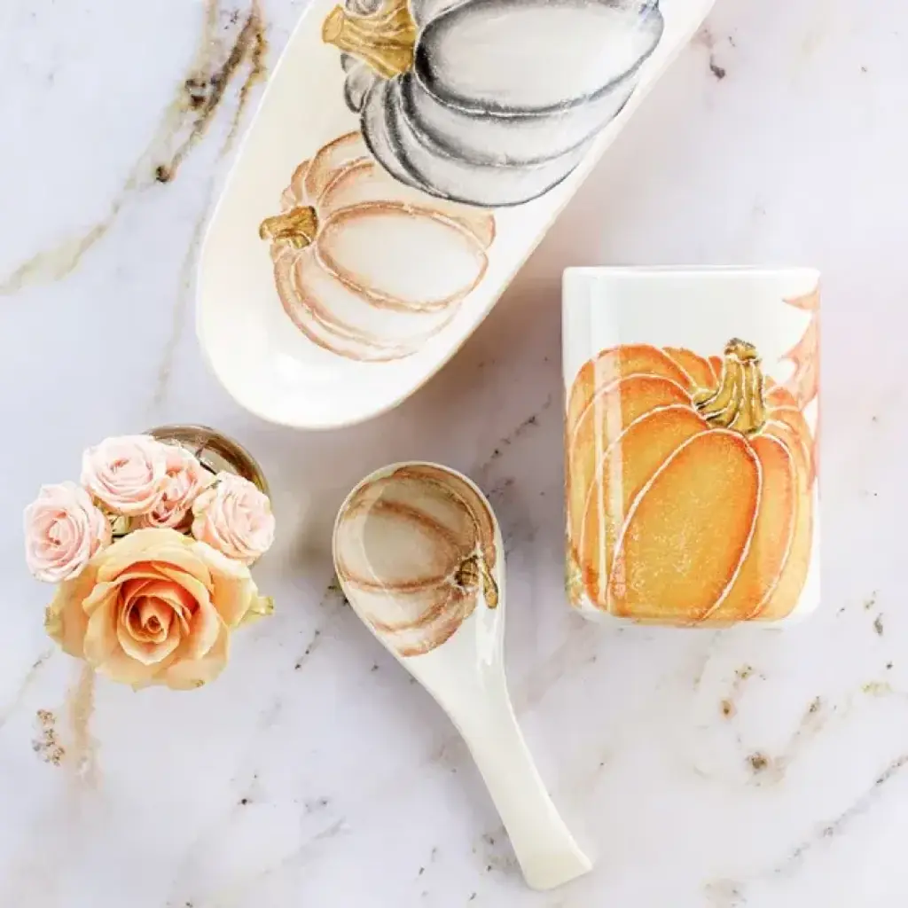 The Pumpkins Utensil Holder captures the vibrant spirit of Florence’s fall street markets. The playful yet sophisticated design celebrates the autumnal bounty, bringing a charming touch of the season to your kitchen. Since 1983, Vietri has specialized exclusively in Italian handcrafted ceramics, stainless and pewter flatware, mouth blown glassware, lamps, urns and planters. Families of artisans with 3 or 4 generations of history create these special pieces using centuries-old techniques. The subtle color from a paintbrush and the curving stroke of the artist's hand are never repeated in quite the same way, making each piece truly unique.