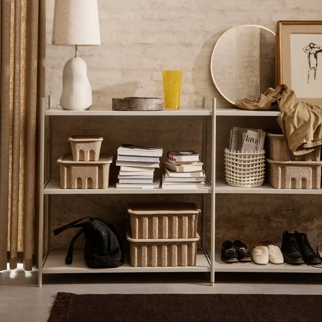 Punctual is a sleek yet durable modular shelving system available in a range of configurations to suit every need. Made to last from powder-coated metal, slender tubes and practical shelves perforated with tiny holes for a softer expression are easy to assemble. The industrial-inspired design has a classical feel thanks to its understated cashmere-colored coating, making it work in any setting from a kitchen to a bedroom.
