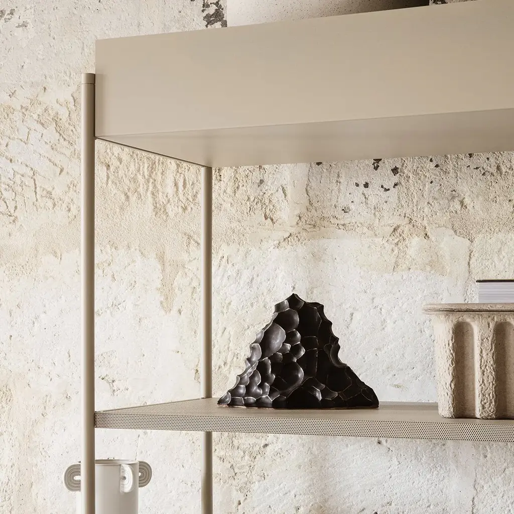 Punctual is a sleek yet durable modular shelving system available in a range of configurations to suit every need. Made to last from powder-coated metal, slender tubes and practical shelves perforated with tiny holes for a softer expression are easy to assemble. The industrial-inspired design has a classical feel thanks to its understated cashmere-colored coating, making it work in any setting from a kitchen to a bedroom.