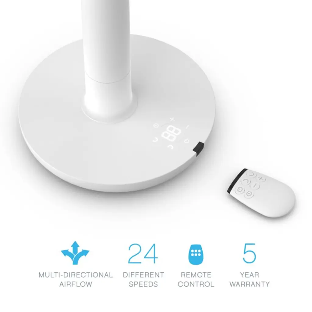 Cool off efficiently with this two-in-one fan that transforms easily from a table or desk fan to a floor fan. Reaching up to 50 feet away, the slim-profile yet powerful fan oscillates vertically and horizontally for full-room coverage. Use the intuitive control panel or the remote control to choose from 24 speeds, 15 automatic timer settings and other features. The thoughtful sleep mode gradually decreases the fan speed to its lowest, whisper-quiet setting. Powerful enough to circulate cool or warm air in large rooms, the compact fan also fits comfortably in closets and other small spaces.
