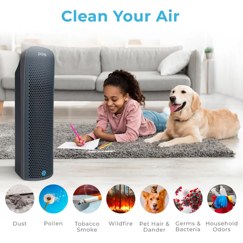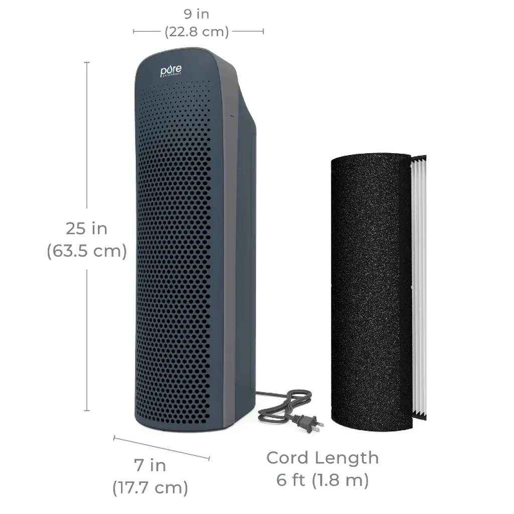 PureZone™ Elite HEPA Air Purifier safely cleans the air in your home making it more breathable, enjoyable, and healthier. In 60 minutes it purifies the air in large rooms that measure 990 sq ft, or just 12.5 minutes in small rooms of 205 sq ft.* The modern design complements any decor and features a sleep mode for clean air while you and your family sleep, 3-speed settings, and an automatic 2, 4, or 8-hour timer to conserve energy and extend the life of the air filters. Plug it in, and notice that the quiet 36-decibel operation and energy star rating contribute to a tranquil atmosphere while helping to protect the environment. The filter reset indicator lets you know when it’s time to change the Active Carbon Pre-Filter and H13 True HEPA Filter. Using a 4-stage purification process – which helps eliminate 99.97% of particles as small as 0.3 microns – PureZone Elite air purifier provides a perfect solution for making the air more comfortable for people who suffer from allergies, asthma, or other breathing issues. PureZone Elite is backed by Pure Enrichment’s industry-leading 5-Year Warranty so your satisfaction is 100% guaranteed.*Filters the air in a 205 sq ft space in 12.5 minutes and a 990 sq ft space in 60 minutes based on ACH recommended removal rate.†Staphylococcus albus (96.6%), Escherichia coli (99.3%), Aspergillus (99.6%), H1N1 (99.9%) independent testing4 STAGE FILTRATION: Large room air purifier filters 99.97% of particles and destroys harmful VOCs with an active carbon pre-filter, H13 true HEPA filter, UV-C light, and ionizer.DEEP CLEAN YOUR AIR: Captures 99.97% of dust and allergens, and eliminates up to 99.9% of viruses and bacteria* (*Staphylococcus albus (96.6%), Escherichia coli (99.3%), Aspergillus (99.6%), H1N1 (99.9%) independent testing)VISIBLE AIR QUALITY: Smart air purifier quality monitor detects air quality and notifies you with a color-coded light indicator.CONTROLLED COMFORT: Hepa air purifier lets you choose between 3 fan speeds and run the product continuously or choose from 3 preset optional timer settings.SINUS AND COLD RELIEF: Home air purifier helps reduce swelling, harmful airborne germs, and other irritants that affect breathing.5 YEAR WARRANTY: Pure Enrichment® is proud to provide our industry-leading 5-year warranty, backed by a customer support team available 7 days a week.PRODUCT SPECIFICATIONS: Size: 9” x 7” x 25” | Power: 120V, 60Hz, 46W | Weight: 9.3 lbs | Coverage Area: Up to 990 sq ft | CADR: 120 CFM | Fan Settings: low, medium, high | Timer Settings: 2hr, 4hr, 8hr