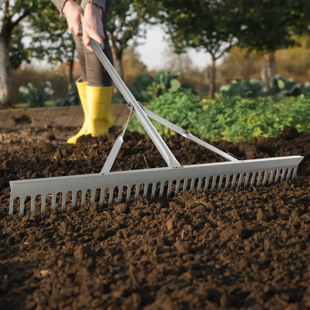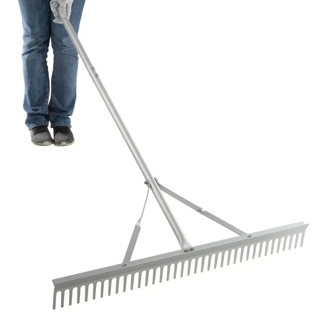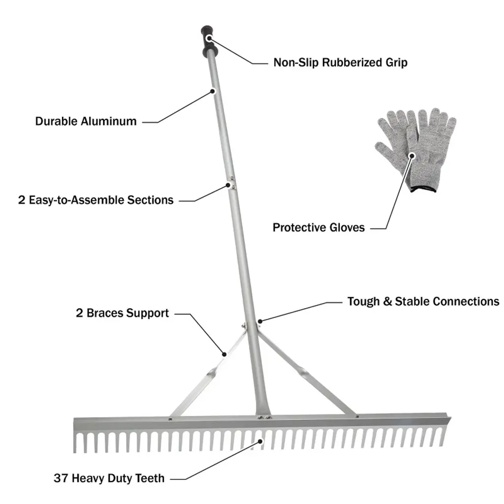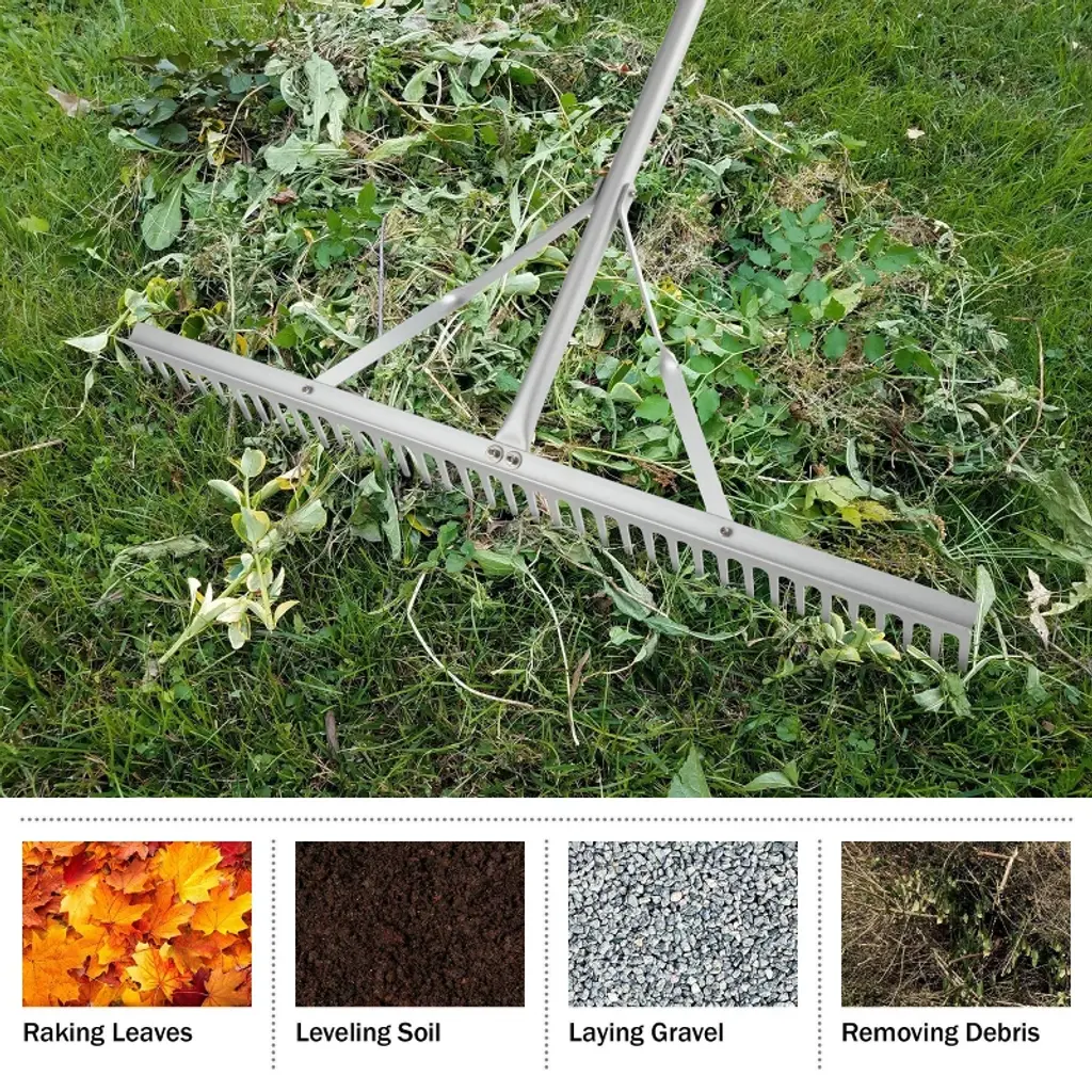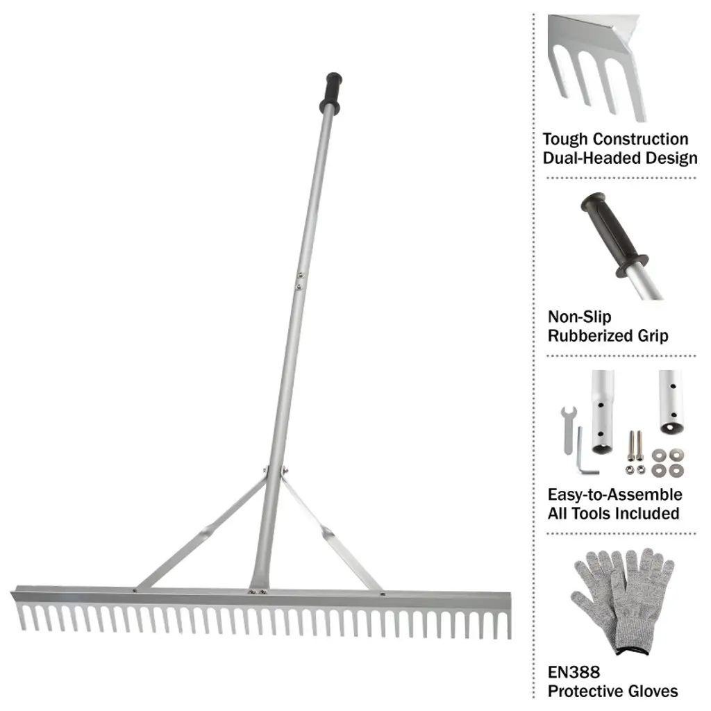 Maintain your lawn and complete a variety of other landscaping tasks with ease with the Heavy Duty Rake by Pure Garden. This handy addition to your gardening tools features a dual-sided head that is flat on one side and fine-toothed on the other, making it perfect for a range of yardwork jobs from raking leaves to weeding, dethatching, leveling, spreading gravel, or even clearing debris from ponds and pools. This thatch rake is constructed from sturdy aluminum with 2 support braces at the head for durability, and the handle can be disassembled into 2 sections by simply unscrewing the connecting screw nuts for more compact storage as needed. Pure Garden is your source for leaf rakes for lawns that make it simple to beautify your outdoor space.