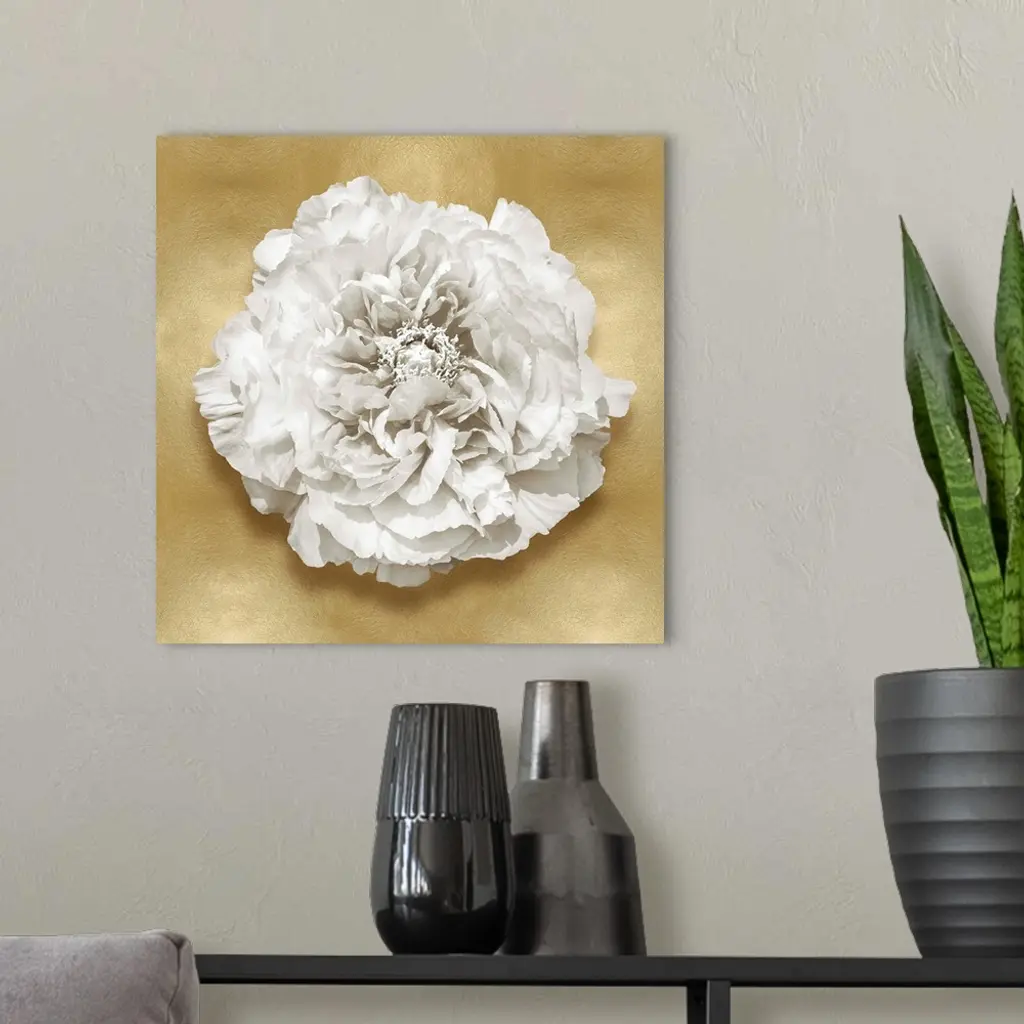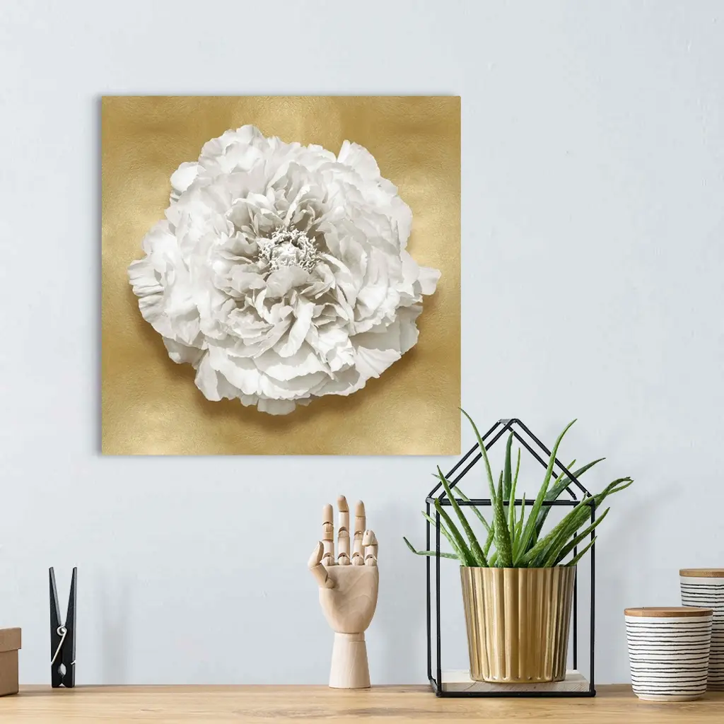 Square decor with a white flower on a gold background.