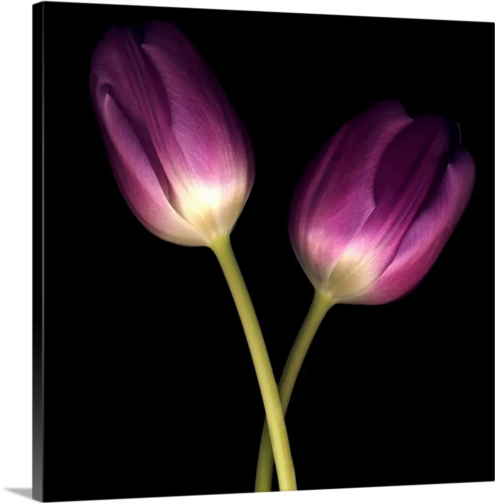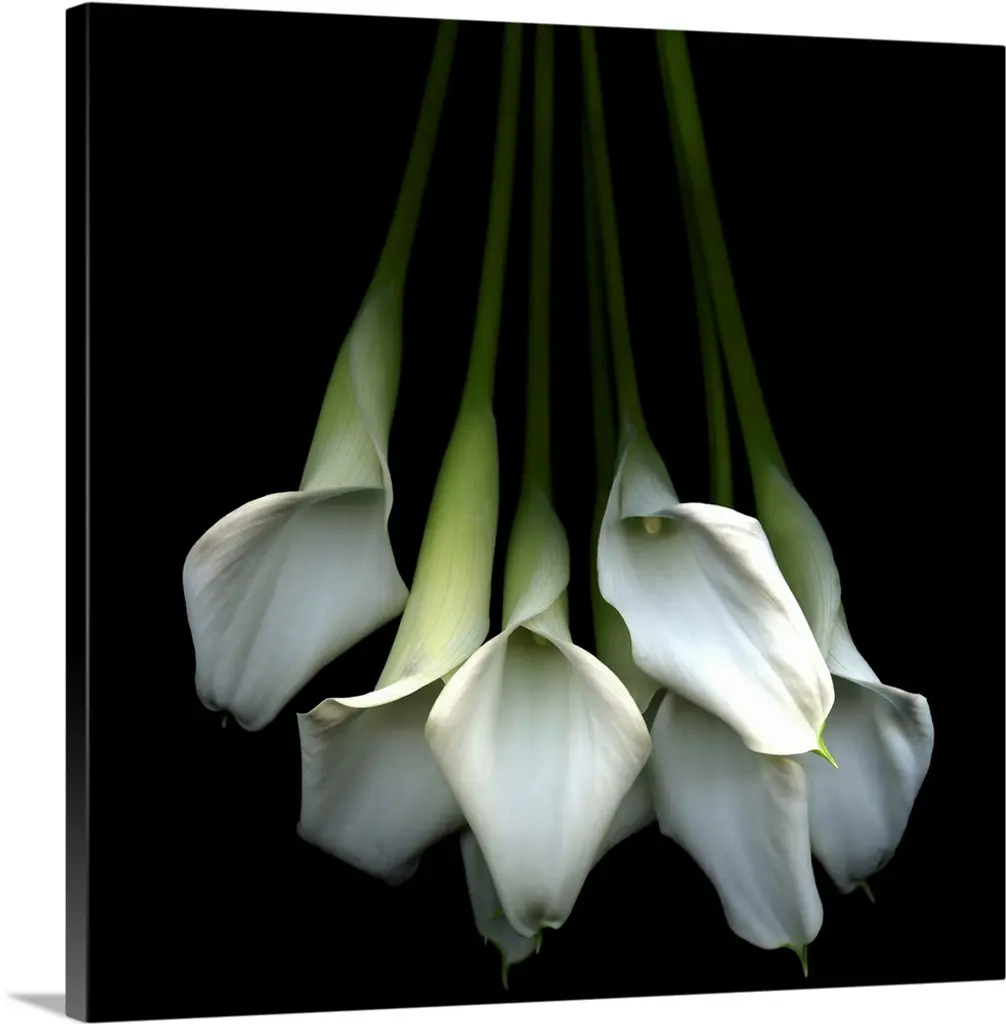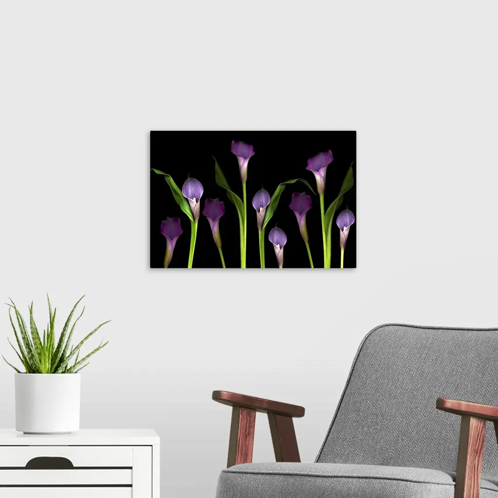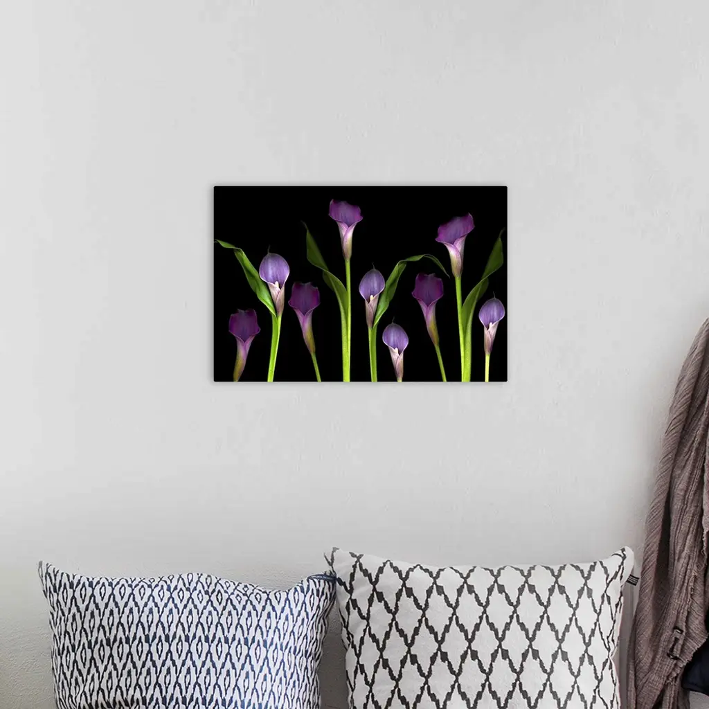 Nine flower blossoms standout from a dark backdrop in this wide minimalist nature photograph for the home or office.