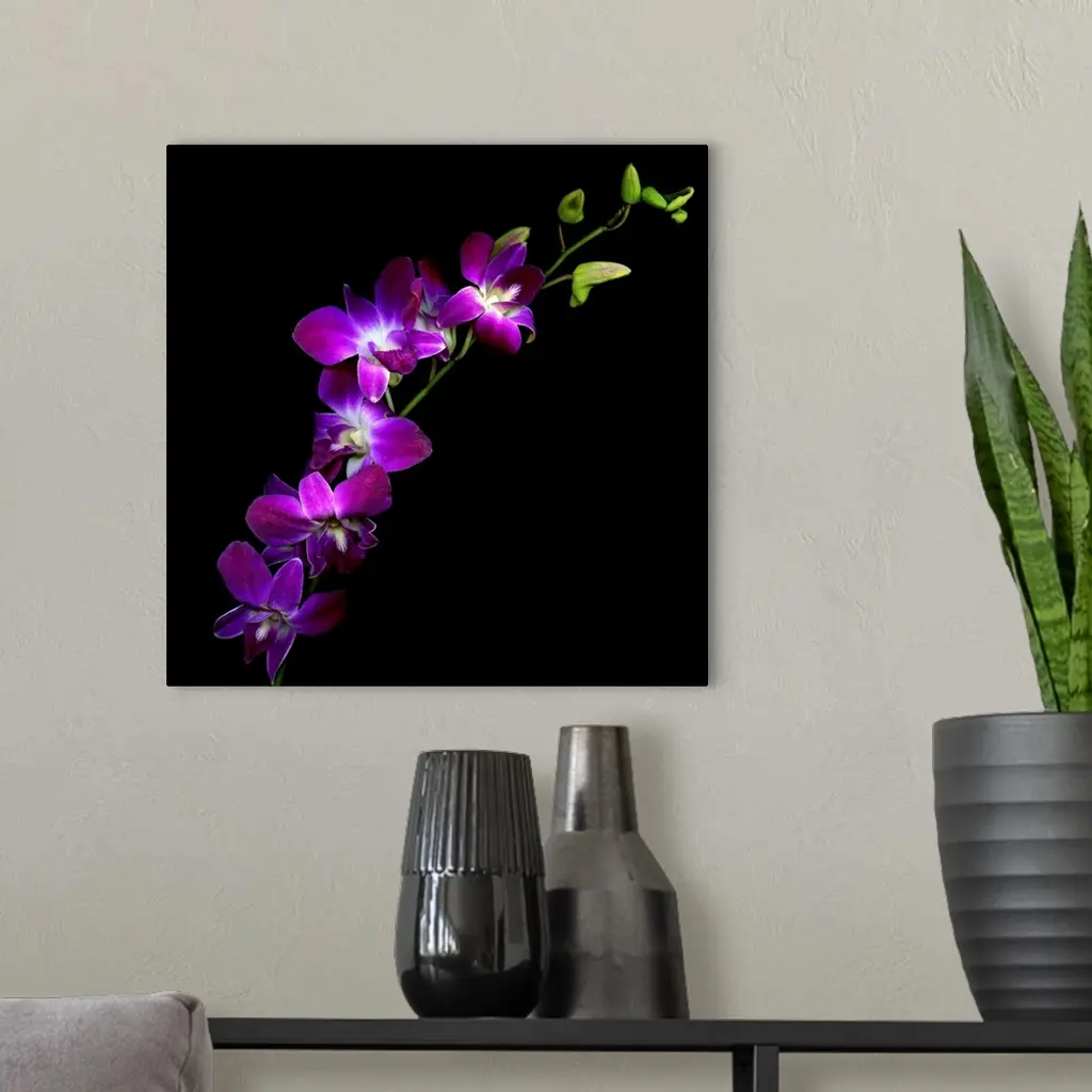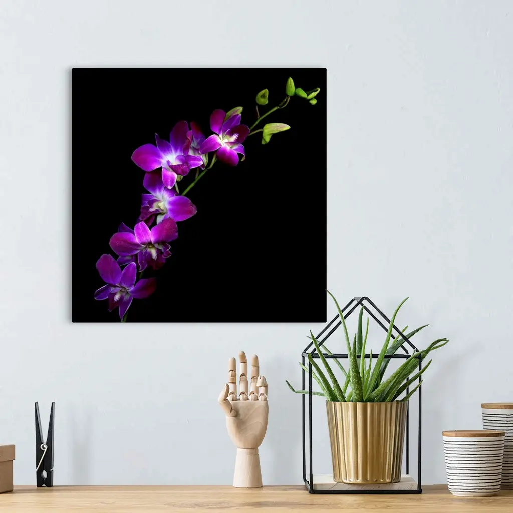 Flowers in front of a dark backdrop on this square wall art for the living room or office.