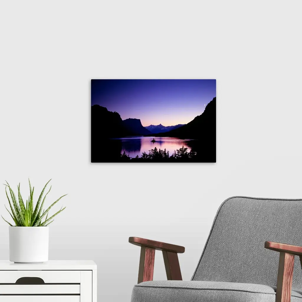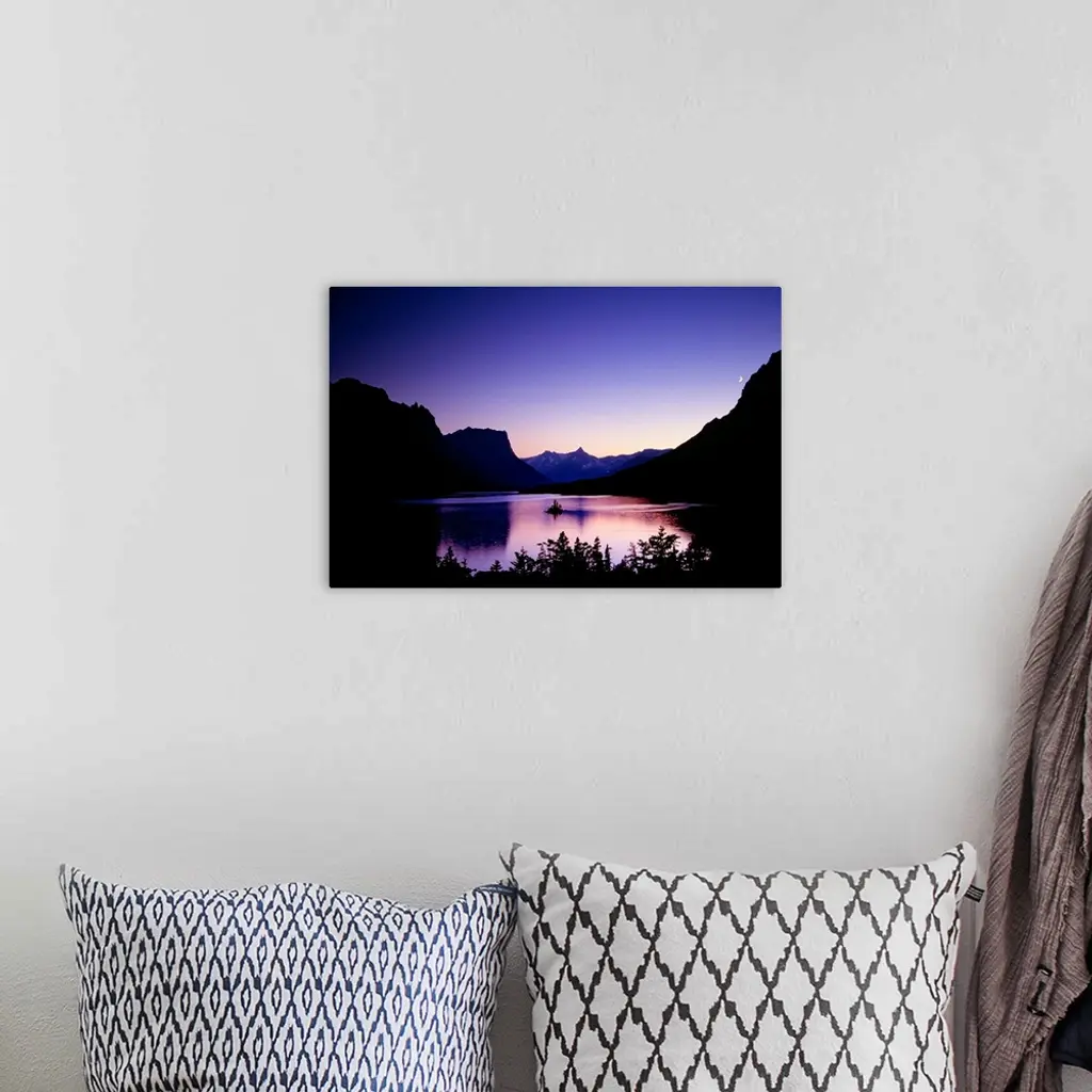 Mountainous terrain is silhouetted by the sunset and a large body of water sits in between. A small crescent moon is shown just above the mountains.