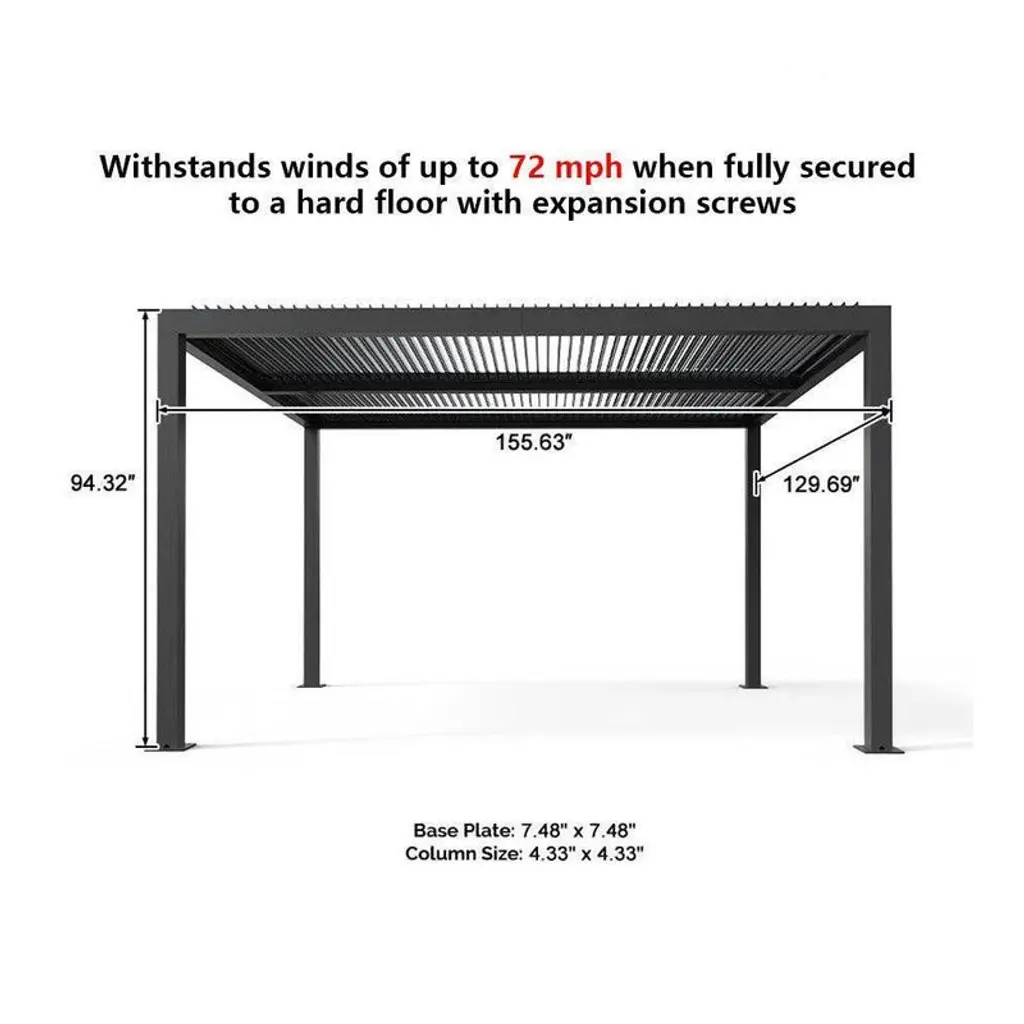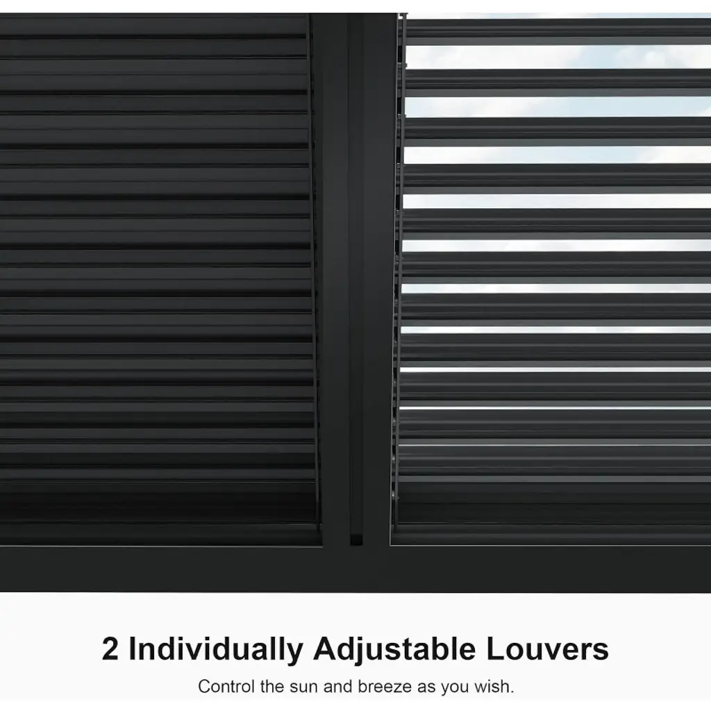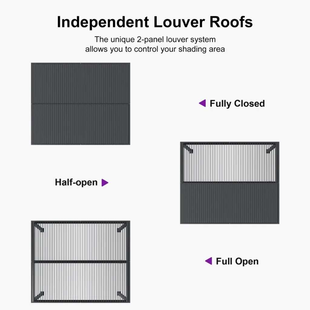· Independent Adjustable Aluminum Louvered Roof: Designed with independent adjustable roofs, equipped with adjustable poles that allow you to adjust it effortlessly from 0° to 90°, offering multiple protection options against sun, rain, and wind. · Concealed Drainage System: The Pergola's drainage system is discretely separated into four corners by a widened and thickened channel, providing uniform distribution. It allows for standing on uneven surfaces without any leakage. · Robust Structure: The crossbeam has undergone an upgrade to dimensions of 4.33''×4.33'', reinforcing safety measures and offering wind resistance of up to 72mph. · Excellent material: The Aluminum Pergola is made with premium powder-coated aluminum, featuring a column thickness of 1.5mm to resist rusting, peeling and fading. · Wide Range of Uses: Design to fit different areas like decks, gardens, and yards, offering you the ideal outdoor sunroom experience. · Easy to Assemble, Assembly instructions and necessary hardware are included. No special rivets, additional materials or welds are required for assembly. Recommend 4-6 people to install. PURPLE LEAF doesn't offer installation service. Furniture NOT INCLUDED! · In the case of high winds, snow or other extreme weather conditions, please open the louvers and raise or remove any shade screen accessories that have been installed to avoid potential damage to your pergola.