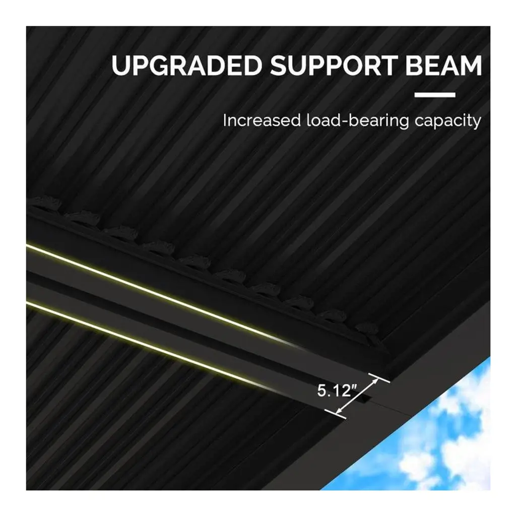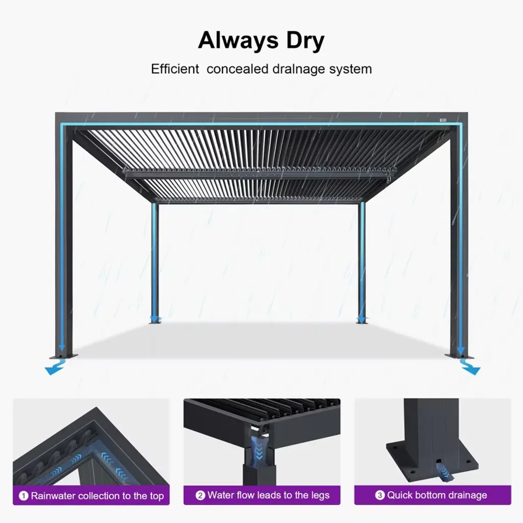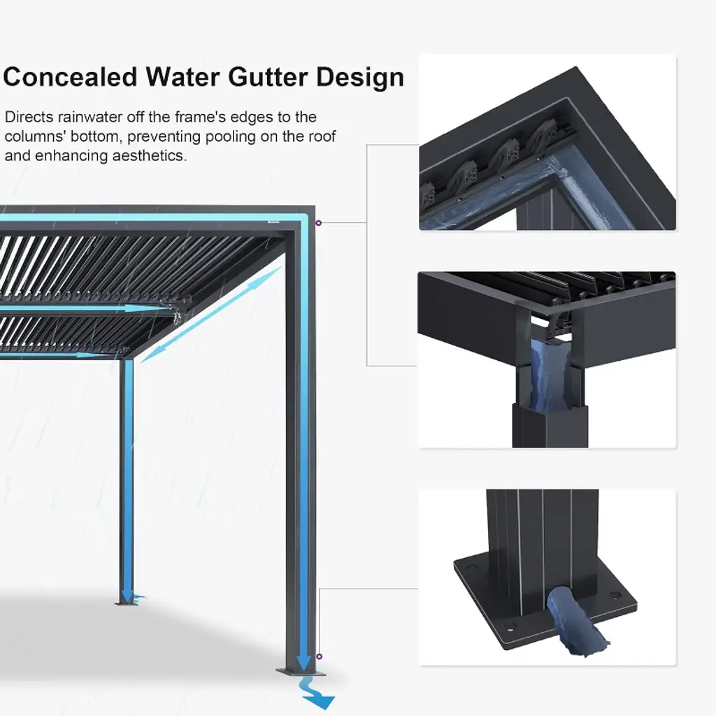 · Independent Adjustable Aluminum Louvered Roof: Designed with independent adjustable roofs, equipped with adjustable poles that allow you to adjust it effortlessly from 0° to 90°, offering multiple protection options against sun, rain, and wind. · Concealed Drainage System: The Pergola's drainage system is discretely separated into four corners by a widened and thickened channel, providing uniform distribution. It allows for standing on uneven surfaces without any leakage. · Robust Structure: The crossbeam has undergone an upgrade to dimensions of 4.33''×4.33'', reinforcing safety measures and offering wind resistance of up to 72mph. · Excellent material: The Aluminum Pergola is made with premium powder-coated aluminum, featuring a column thickness of 1.5mm to resist rusting, peeling and fading. · Wide Range of Uses: Design to fit different areas like decks, gardens, and yards, offering you the ideal outdoor sunroom experience. · Easy to Assemble, Assembly instructions and necessary hardware are included. No special rivets, additional materials or welds are required for assembly. Recommend 4-6 people to install. PURPLE LEAF doesn't offer installation service. Furniture NOT INCLUDED! · In the case of high winds, snow or other extreme weather conditions, please open the louvers and raise or remove any shade screen accessories that have been installed to avoid potential damage to your pergola.