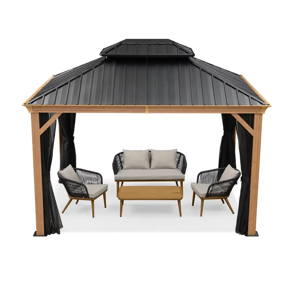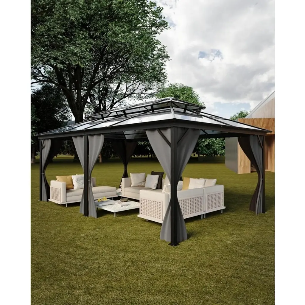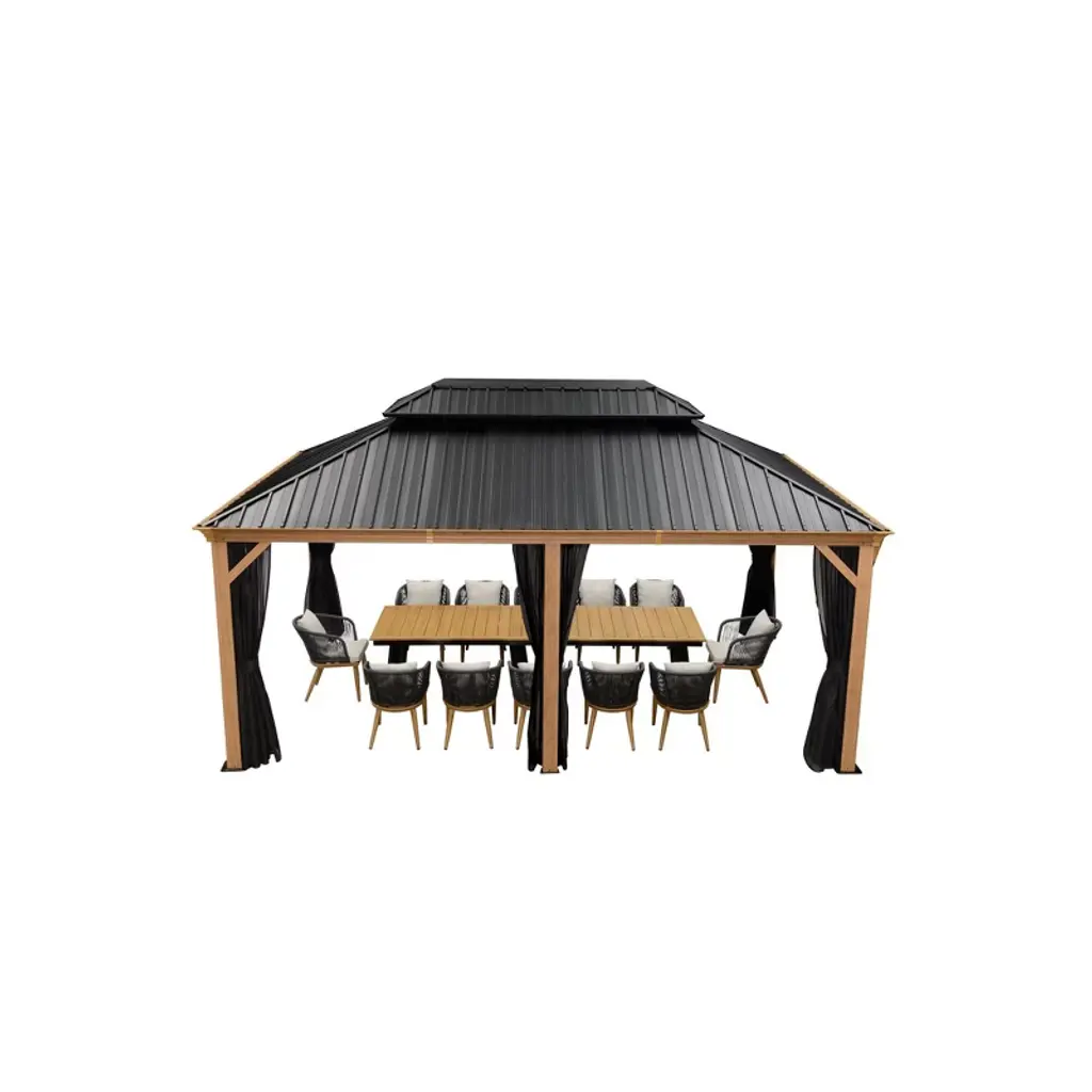 Purple Leaf 12' X 12' Outdoor Hardtop Gazebo For Patio Galvanized Steel Double Roof Teak Finish Coated Aluminum Frame Pavilion Gazebo With Netting