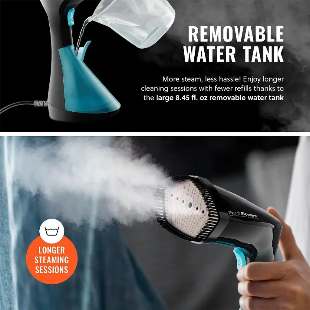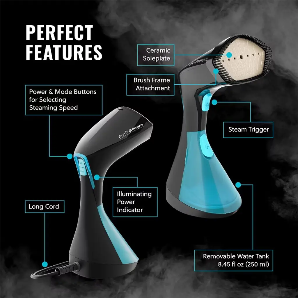 Introducing the PurSteam SteamWave, the handheld garment steamer designed to effortlessly refresh and revive your entire wardrobe. Built with a spacious, easy-fill water tank and engineered to deliver powerful steam bursts, the SteamWave removes stubborn wrinkles fast—so you can step out looking polished and professional in no time. Its ergonomic design and non-stick soleplate glide smoothly over a variety of fabrics, while the removable brush frame attachment adds extra versatility by helping lift and loosen fibers for deeper steam penetration. From delicate silk blouses to heavy winter coats, the SteamWave is your ultimate all-in-one solution for crisp, wrinkle-free clothes. Safe to use vertically or horizontally, this travel-friendly steamer simplifies your routine and ensures you’ll always look your best, at home or on the go.