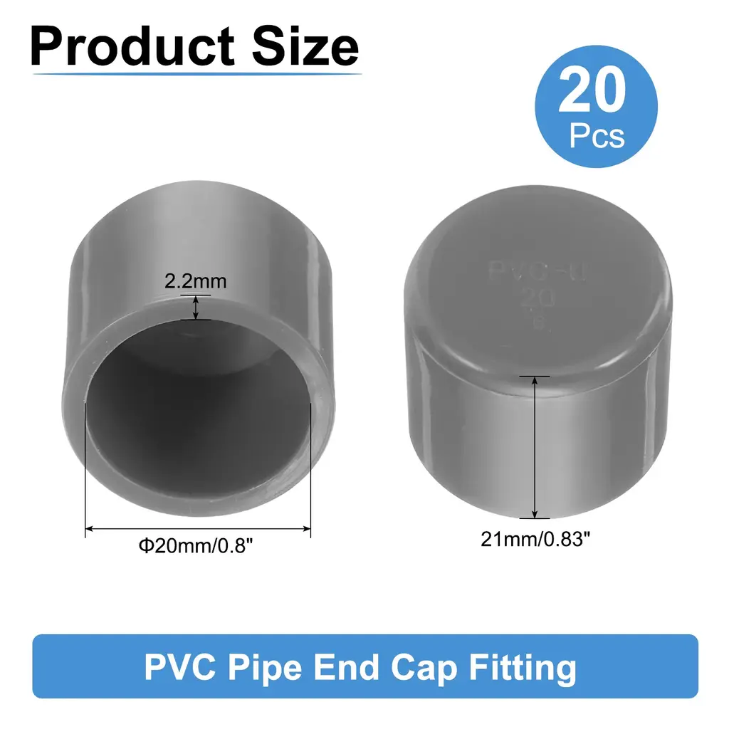 Description:Durable Material: The pipe end cap fitting is made of PVC material with a thickened pipe wall, the smooth interior surface ensures easy to use, which is durable, corrosion-resistant, and not easy to break and deformClose the Pipe: The pipe end cap plug adapter prevents foreign objects from falling into the pipe and causing it to be blocked. Close the end of the pipe to stop the water flow and direct the water to the open endEasy to Install: Apply solvent-based adhesive to the inside of the pipe plug or the outside of the pipe for bonding and connection for a permanent and leak-proof connection. After 24 hours of water use, the bonding effect will be better(Solvent-based adhesive not included)Wide Application: PVC pipe plug socket fittings are suitable for covering and decorating the ends of various sewers, drain pipes, and ventilation pipes. They are also used to build racks, DIY garden shelves, greenhouse vegetable planting, irrigation systems, garden support structures, etc.Specifications:Color: GreyMaterial: PVCFit for Pipe Dia.: 20mm/0.8"Pipe End Cap Thickness: 2.2mmInner Height: 18.8mm/0.74"Total Height: 21mm/0.83"Package Contents: 20 Pcs x PVC Pipe End Cap Fittings