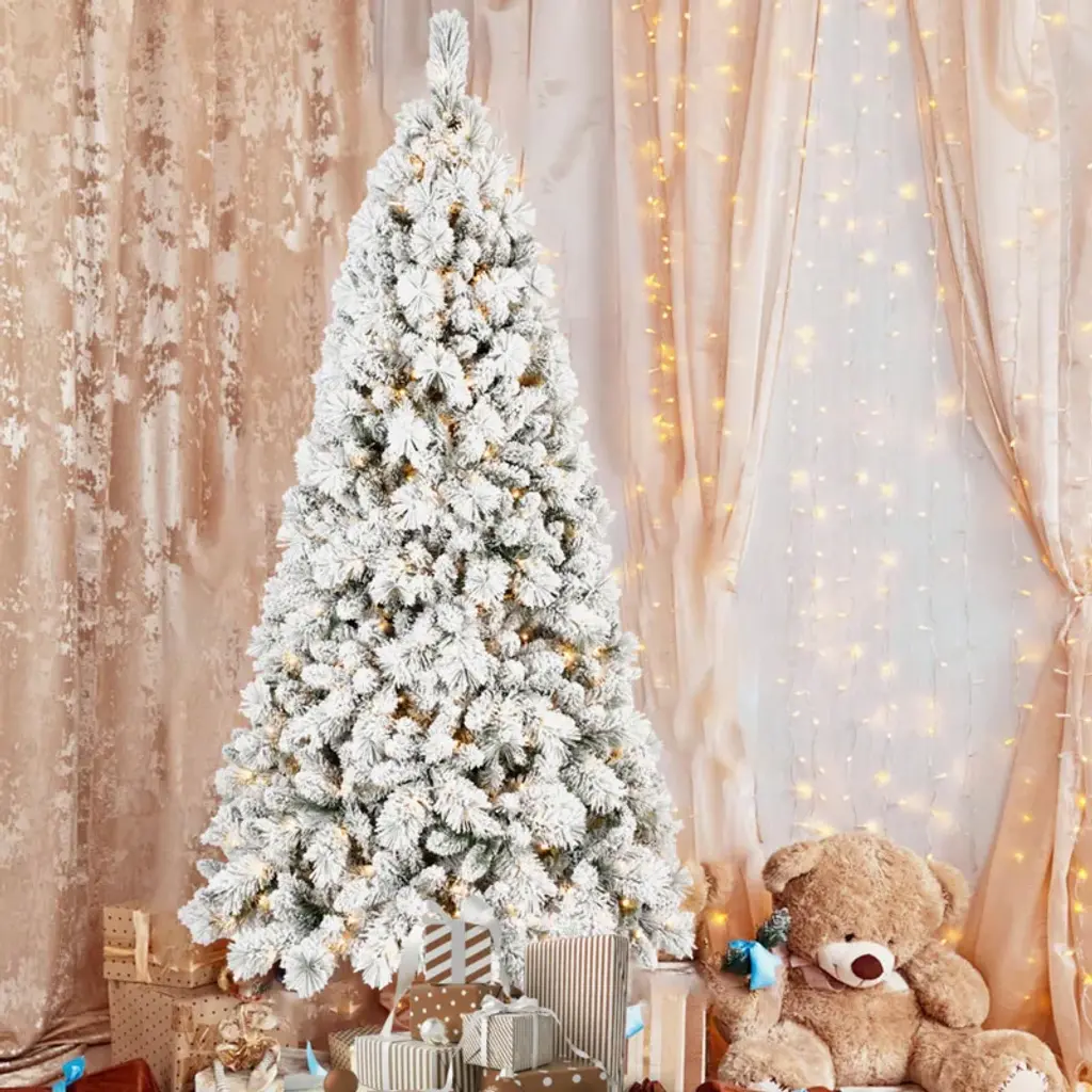 Pvc White Flocked Christmas Tree With Lights - N/a - 7 Foot - White
