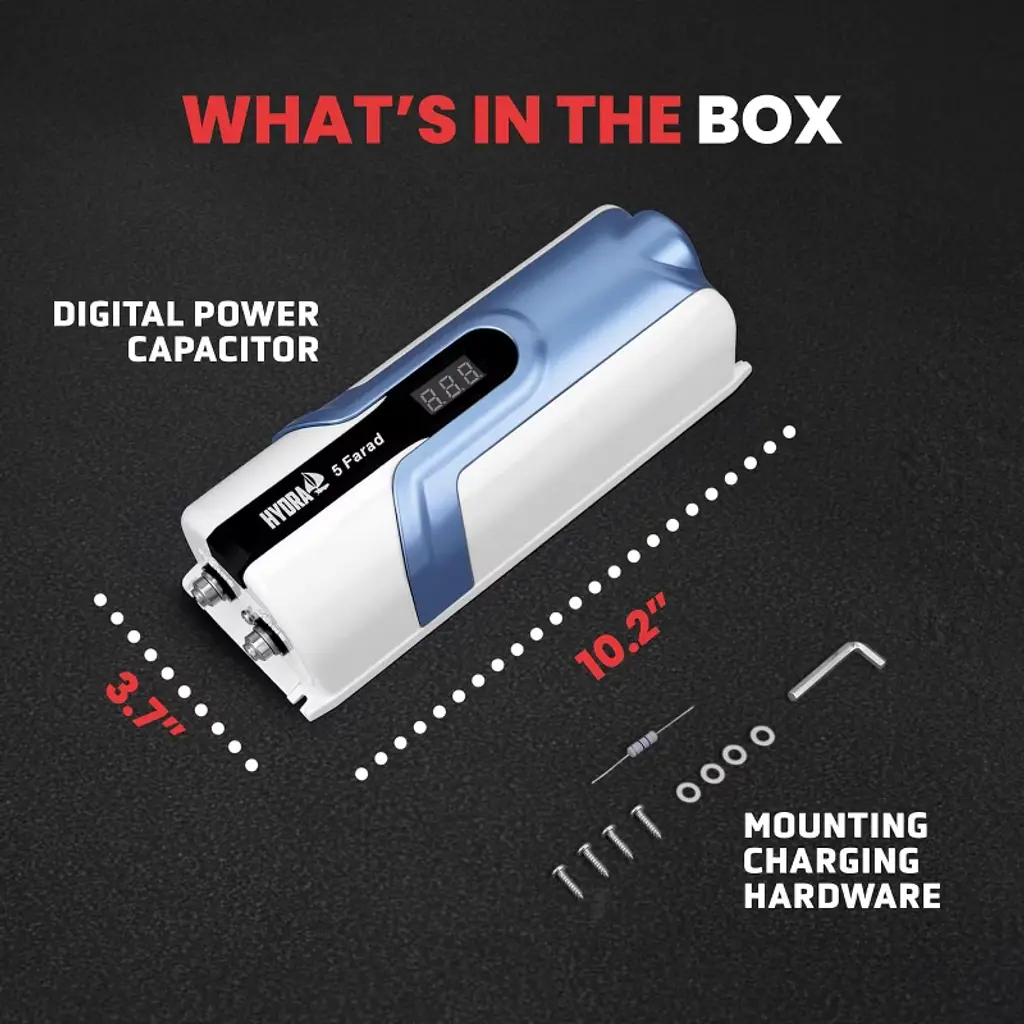 Enhance your car’s audio performance with the Pyle 0.5 Farad Digital Power Capacitor. This high-performance audio accessory ensures your sound system gets the stable power it needs with its 0.5 Farad capacitance. The blue digital display allows you to easily track power levels while over voltage and electronic polarity protection circuits ensure safe use. The durable ABS housing and sleek aluminum brushed interior provide robust construction, while the chrome-plated post kits ensure a secure connection. Whether you're upgrading your car’s sound system or enhancing its performance, this capacitor is designed for easy installation and reliable results.