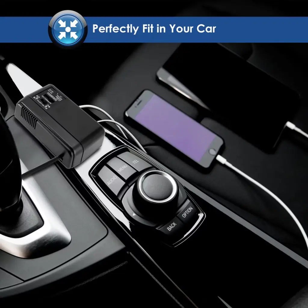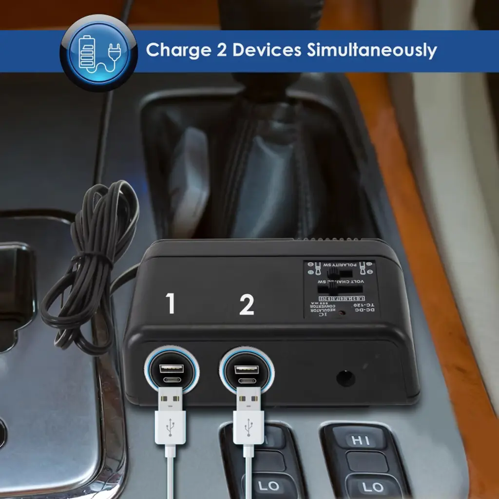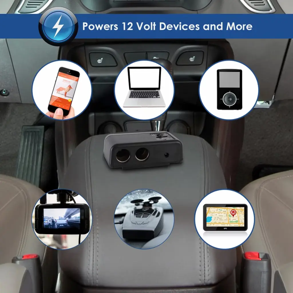 This power multiplier is designed with two front-mounted female lighter ports and is powered by a single male lighter plug. It’s ideal for use in cars, trucks, RVs, and other vehicles, ensuring that your electronics stay charged during long trips or commutes.