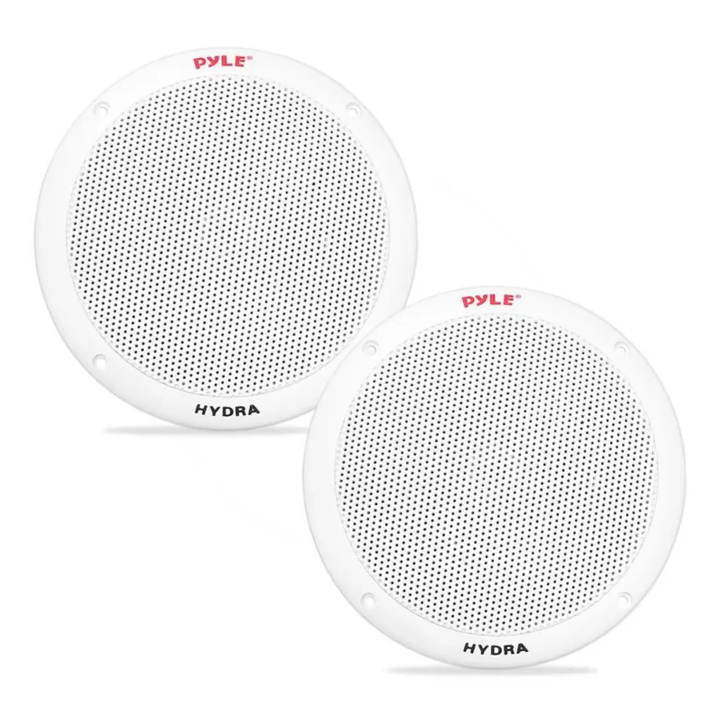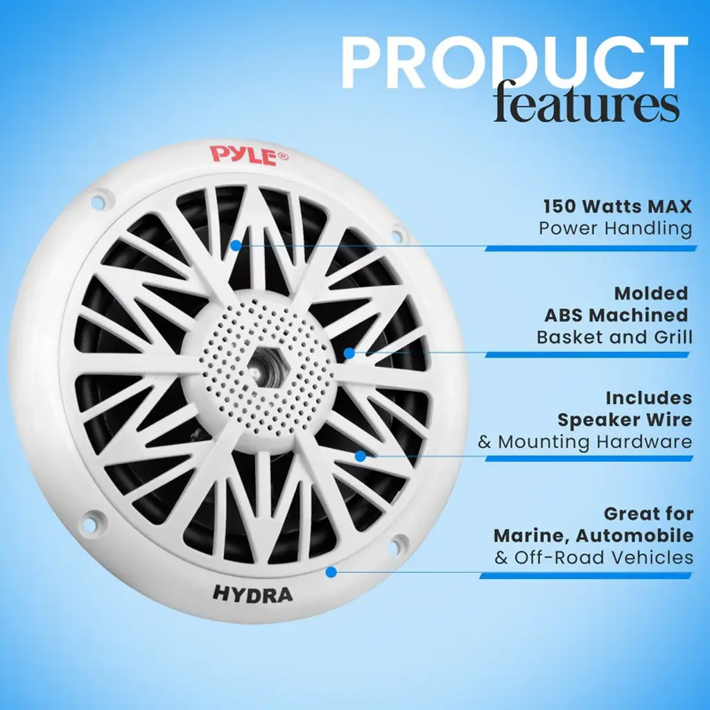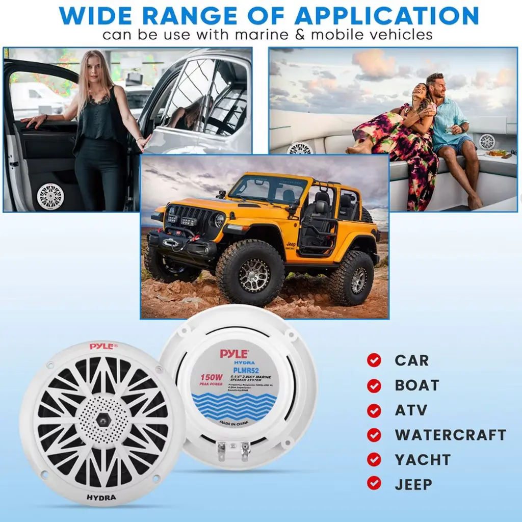 The Pyle PLMR52 Marine Speakers are a reliable choice for high-quality audio performance in various marine environments. Designed for use on boats, docks, poolsides, and outdoor installations, these 5.25" 2-way speakers feature a robust waterproof and weather-resistant construction. Each speaker boasts a maximum power output of 150 watts and includes a high-temperature 1" aluminum voice coil for smooth mids and lows, alongside a 0.5" neodymium dome tweeter for crisp highs. The poly carbon cone with cloth surround and molded ABS machined basket ensure durability and distortion-free sound. With a sensitivity of 88dB and a frequency response range of 100Hz to 20kHz, these speakers deliver clear, full-range stereo sound. Perfect for marine, automobile, and off-road vehicles, these speakers also come with universal standard OEM replacement size, making installation straightforward.