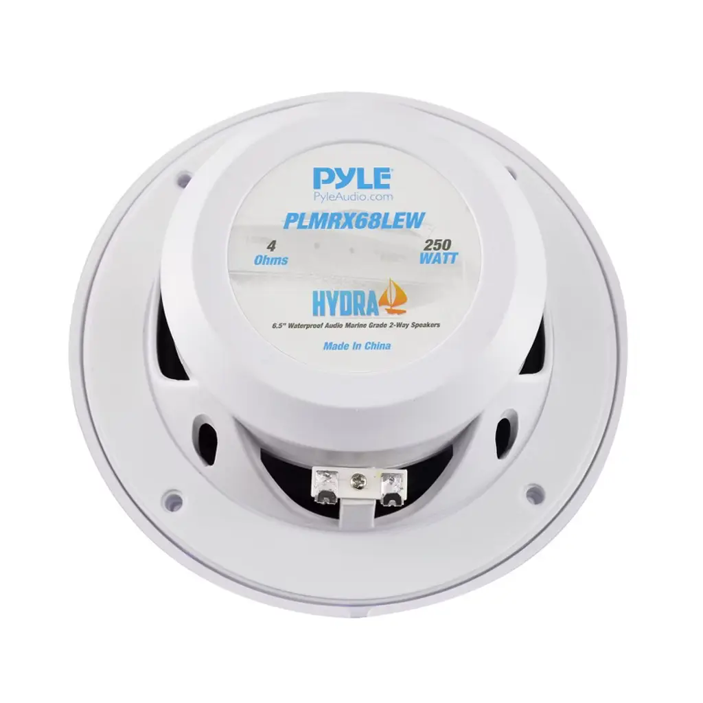 Enhance your audio setup with the Pyle Hydra Waterproof 6.5'' Dual Speakers, featuring built-in programmable multi-color LED lights. These speakers not only deliver crisp, 2-way stereo sound with a peak power handling of 250 watts, but they also create a stunning visual display that will elevate any gathering. The remote control allows you to easily customize the lighting effects, including dancing and flashing modes, as well as adjusting color and brightness. With a rugged, waterproof construction, they are ideal for installation in marine vehicles or cars, ensuring durability in any environment. Equipped with polypropylene cones and a stain-resistant grill, these speakers are built to last while providing an exciting auditory and visual experience. Upgrade your audio system today with Pyle Hydra Waterproof Speakers.