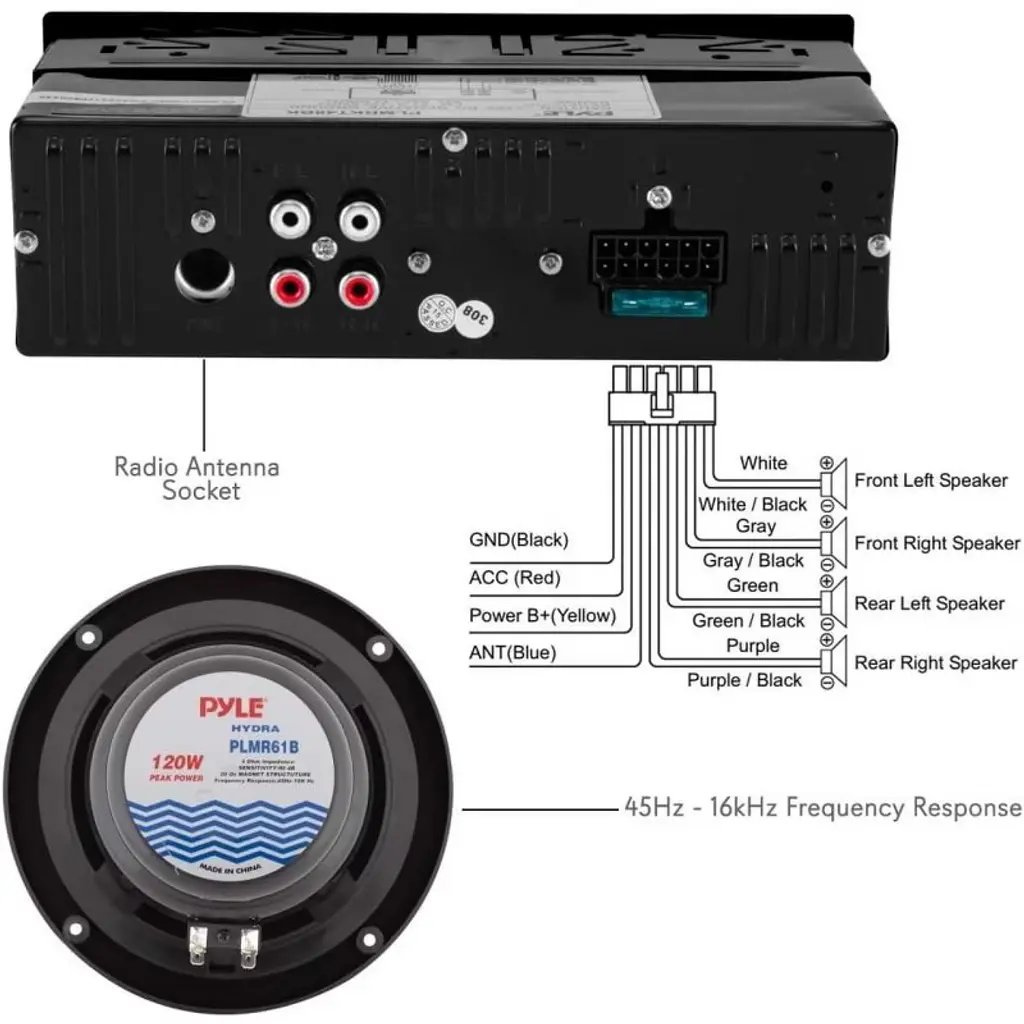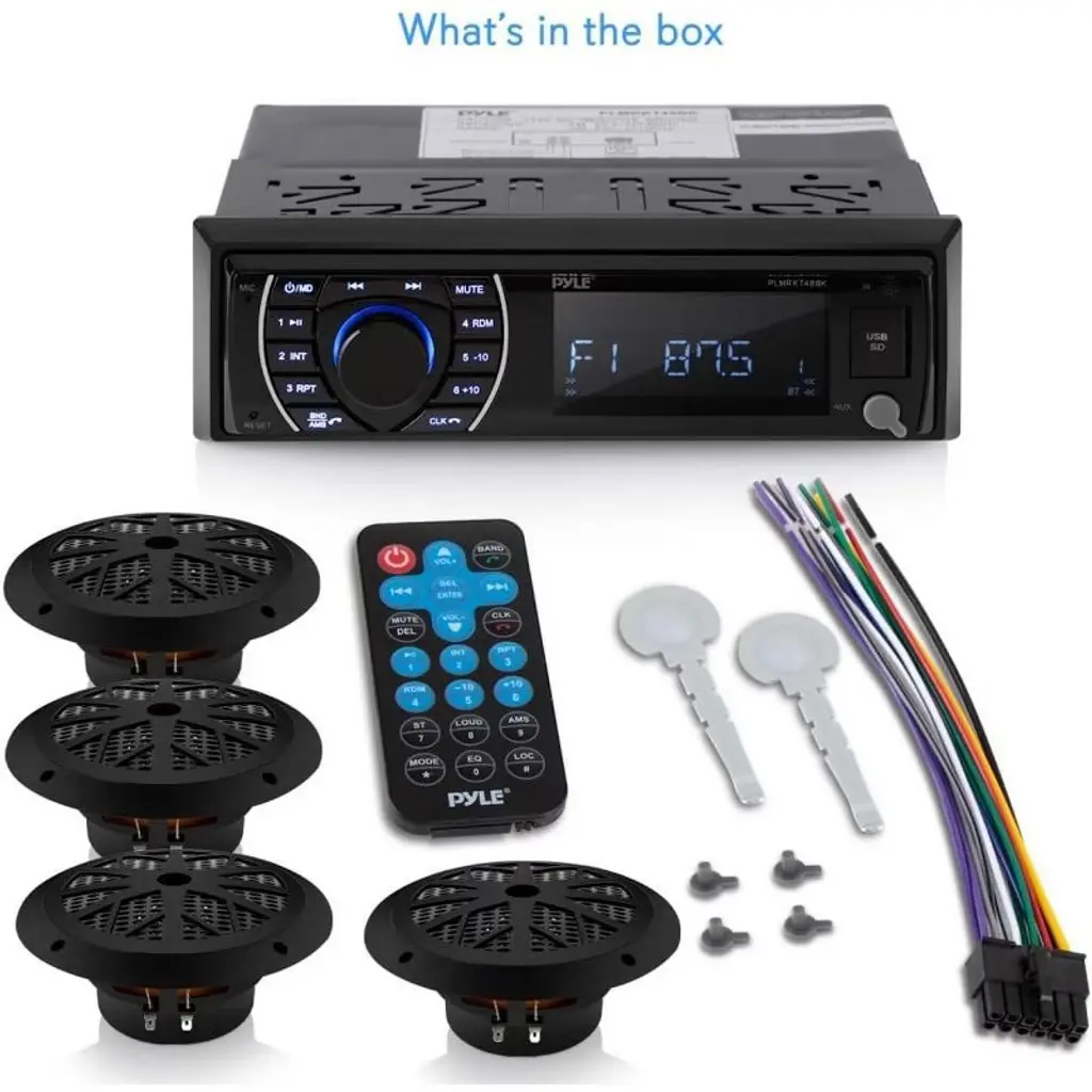 The Pyle PLMRKT48BK Bluetooth Marine Stereo Kit offers a complete audio upgrade for your marine or vehicle system. The kit includes a Bluetooth-enabled marine receiver that supports wireless music streaming, hands-free calling, and a variety of digital audio files (MP3, WMA). It comes with four 6.5'' waterproof marine speakers designed for clear, full-range sound. Additionally, the receiver includes AM/FM radio with 30 presets, a USB flash drive reader, a micro SD card reader, and an Aux input jack for easy connection to external devices like smartphones, tablets, and MP3 players.
