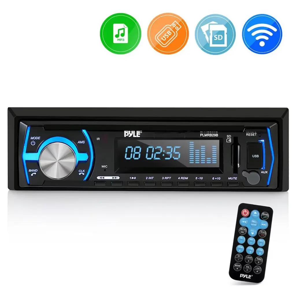 The Pyle PLR38I Stereo Receiver is a versatile in-dash audio hub, perfect for upgrading your car's entertainment setup. It features a unique pop-out dock for iPod or iPhone devices, allowing easy charging and music playback while driving. This compact unit includes AM/FM radio, a multi-color LCD digital display, and built-in front-facing USB and SD ports for playing your favorite MP3 or WMA files. With ID3 tag support, you can easily view track info directly on the screen. The 3.5mm AUX-in jack adds compatibility with other media players, and rotary knobs make it easy to adjust tone, volume, and tuning. Its semi-detachable faceplate enhances security, while the unit delivers up to 200 watts across 4 channels for rich, immersive audio.