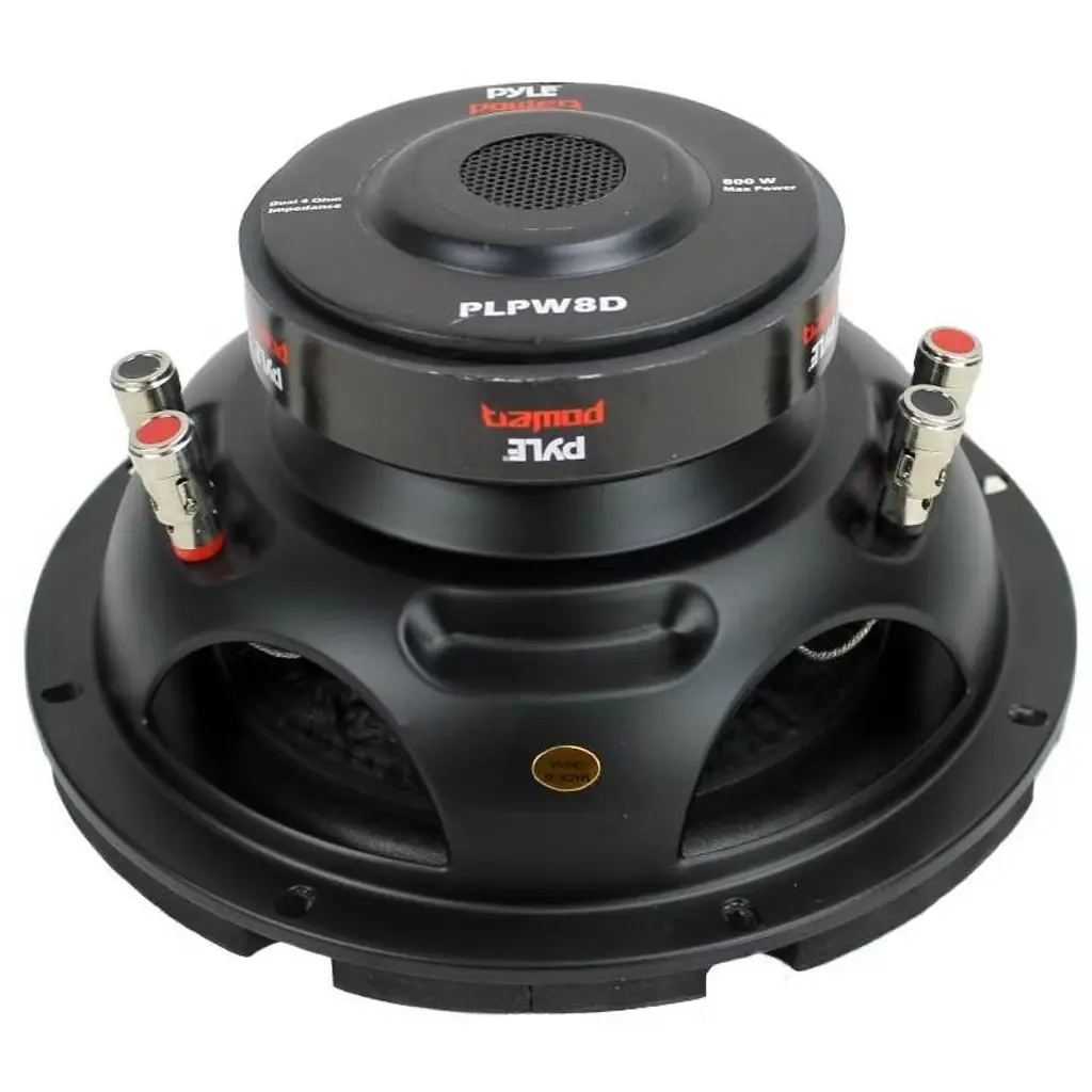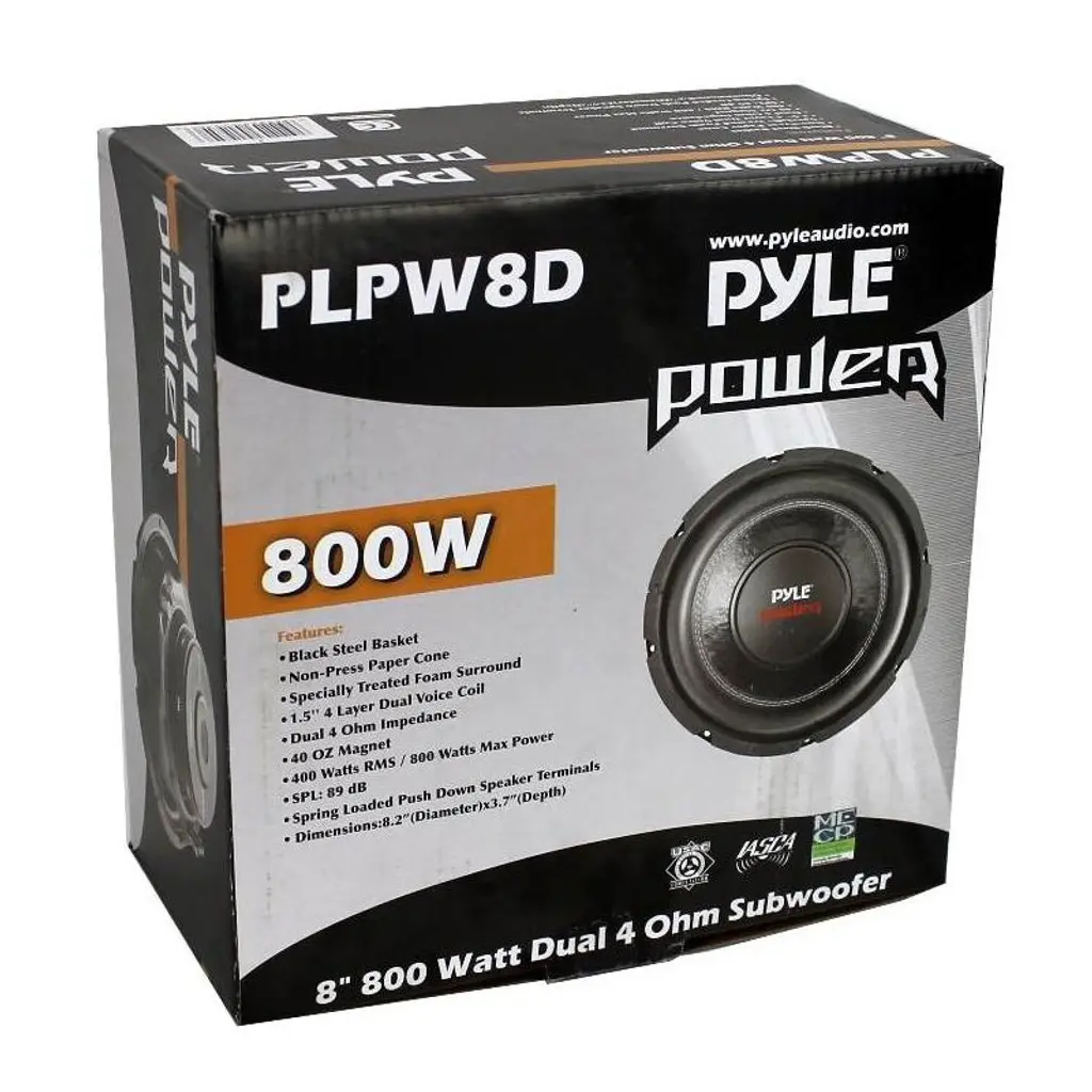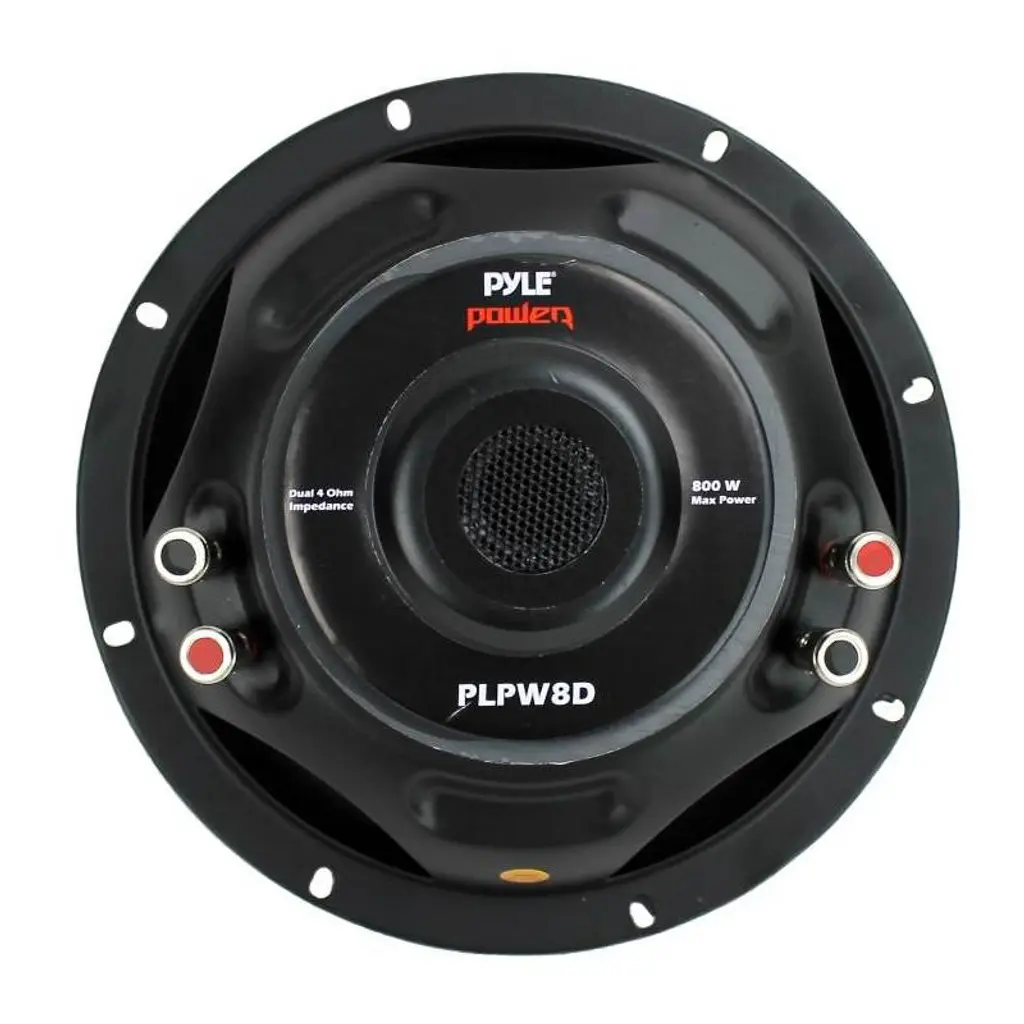 The PYLE **PLPW8D** 8" 800W Dual Voice Coil 4 Ohm Car Audio Subwoofer can handle 800 Watts of MAX power! It features specially treated foam surround, non press paper cone, black steel basket, 1.5" 4" layer dual voice coil, 40 oz magnet, SPL of 89 dB and spring loaded push down speaker terminals. Give your car audio system serious BASS with the PYLE **PLPW8D** 8" 800W Dual Voice Coil 4 Ohm Car Audio Subwoofer. This subwoofer also comes with 1 year manufacturer warranty! 1 buy = 1 subwoofer **We are an Authorized PYLE Dealer**