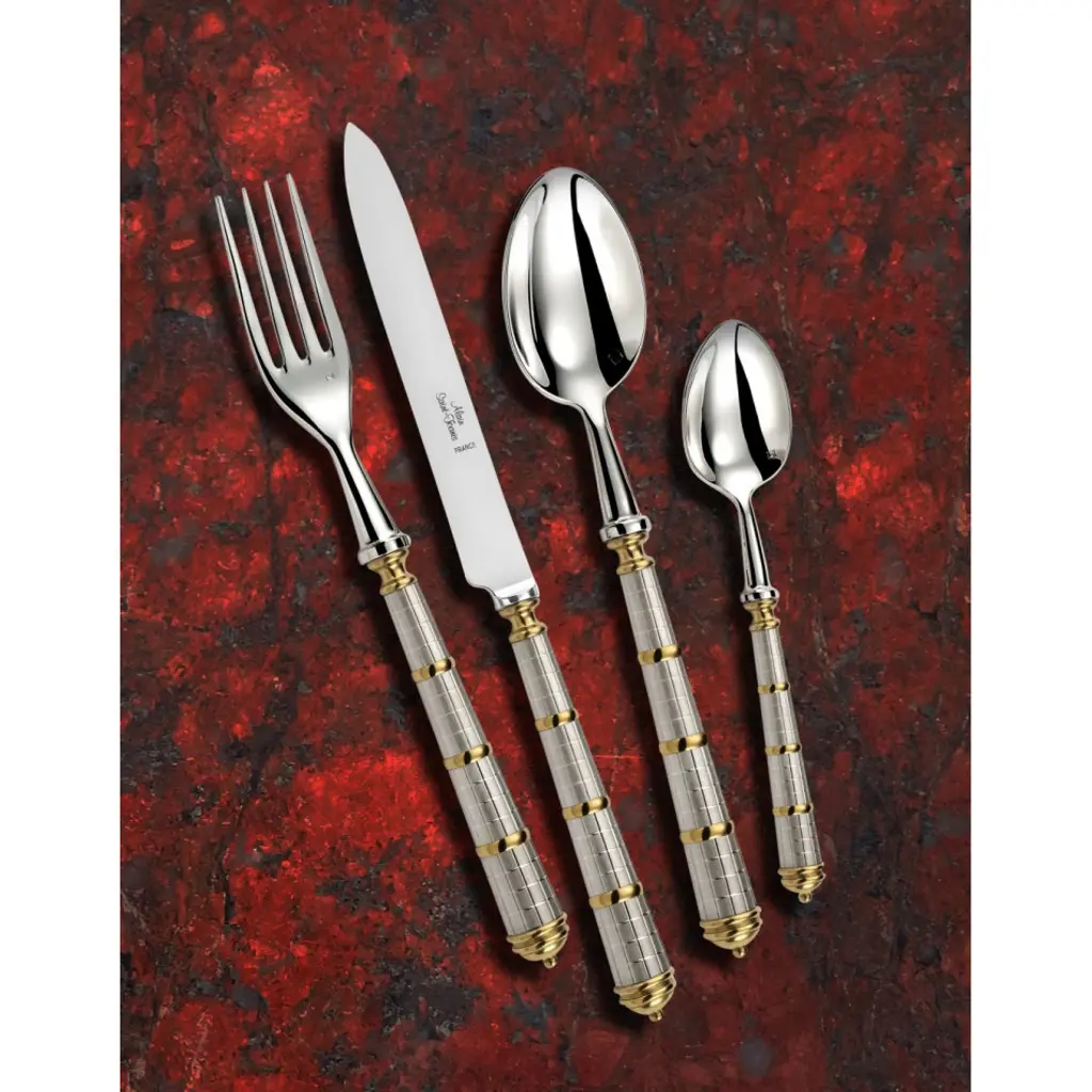 Alain Saint Joanis is a family-owned company that has been creating and manufacturing fine flatware in the purest tradition of French cutlery since 1876. These top-of-the-line collections are made with the finest quality silverplate and 18/10 stainless steel, with handles handcrafted from authentic, raw materials such as exotic woods, resins and enamels. All Alain Saint Joanis flatware is hand-assembled and hand-polished in France, and is dishwasher safe. Five-piece setting includes dinner knife, dinner fork, salad fork, soup spoon, and tea spoon.