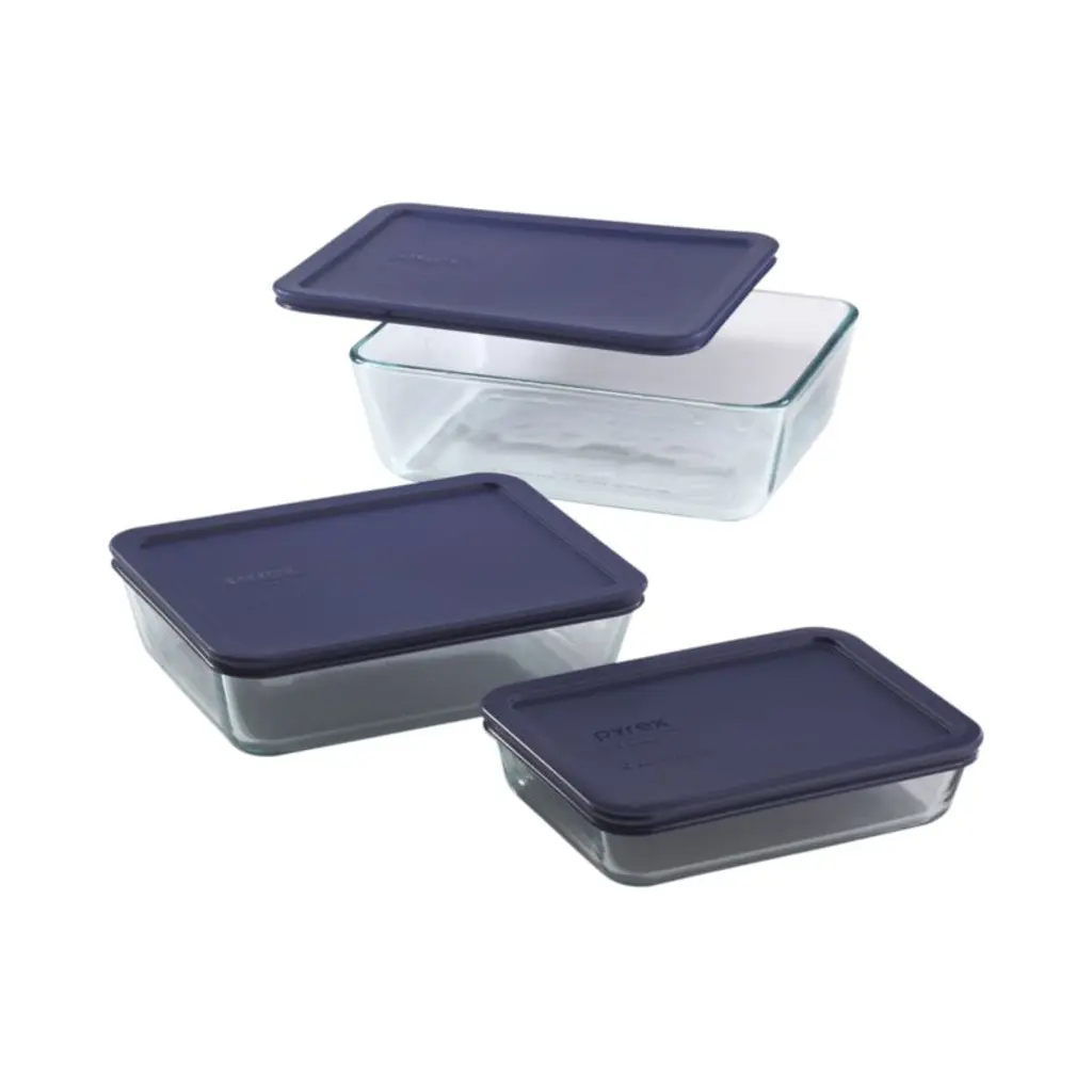 This versatile set from glassware legend Pyrex heats, stores and reheats. Neatly stackable, the six-piece set stores compactly whether empty or filled. Three rectangular stain- and odor-resistant glass dishes hold leftovers and heat them safely in the microwave or oven, while blue lids provide an airtight seal to keep food fresh. This set includes 3-, 6- and 11-cup rectangular lidded dishes.Pyrex has been making innovative, durable cookware and food storage for over a century.