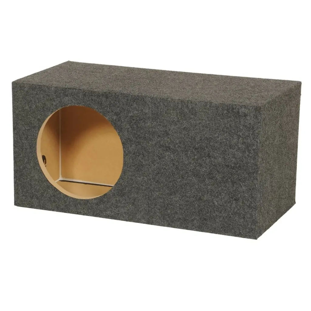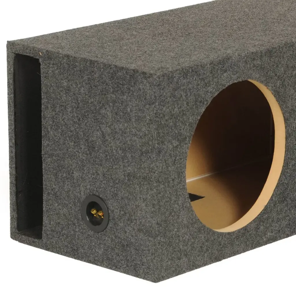 If you prefer your subwoofer enclosure side ported, you're in luck. The Q Power Single 12-Inch Side Ported Subwoofer Enclosure is a heavy-duty sub box that brings your audio to life in the way only a side ported enclosure can. This box fits a 12-inch subwoofer on the right side port. It's made with heavy-duty materials including MDF wood, a durable carpet covering, and plastic push terminals. It also has a 1-inch MDF faceplate and 0.75-inch MDF on sides and back. With a mounting depth of 10.4 inches and an internal air space of 3 cubic feet, your sub will have plenty of room to blast your music.